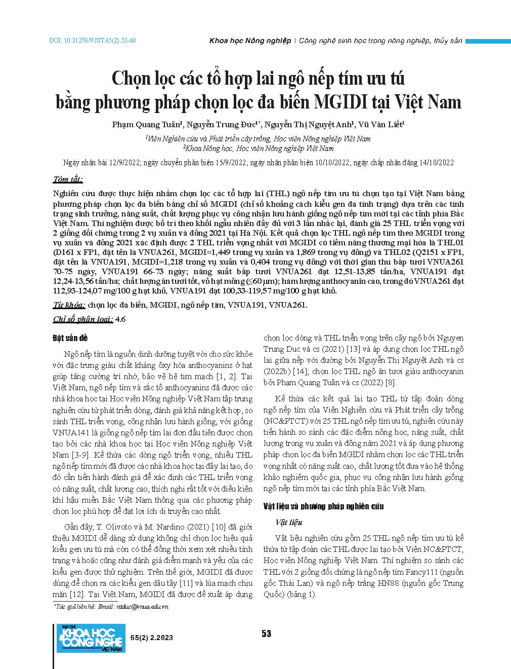 Chọn lọc các tổ hợp lai ngô nếp tím ưu tú bằng phương pháp chọn lọc đa biến MGIDI tại Việt Nam. = Selection of elite purple waxy corn hybrids by MGIDI multivariate selection method in Vietnam