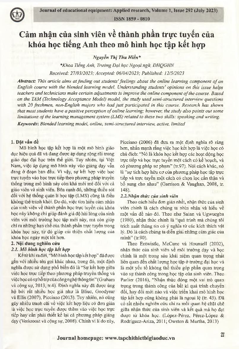 Cảm nhận của sinh viên về thành phần trực tuyến của khóa học tiếng Anh theo mô hình học tập kết hợp = Research on students' perceptions of the online component of the blended learning English course