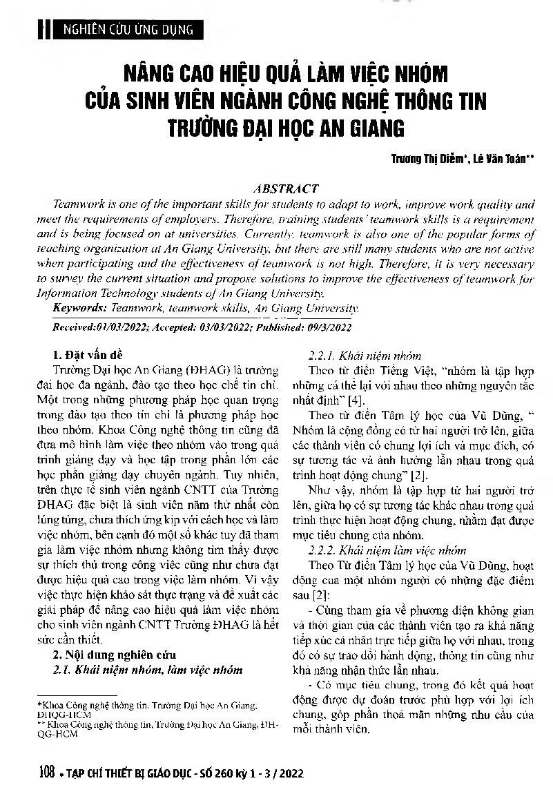 Nâng cao hiệu quả làm việc nhóm của sinh viên ngành Công nghệ thông tin Trường Đại học An Giang = Improving the effectiveness teamwork of information technology students of An Giang University