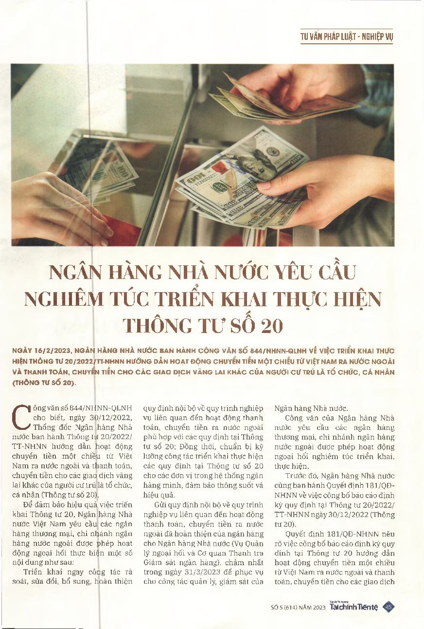 Ngân hàng Nhà nước yêu cầu nghiêm túc triển khai thực hiện Thông tư số 20 = The State Bank of Vietnam requests commercial banks to strictly implement provisions of Circular No.20