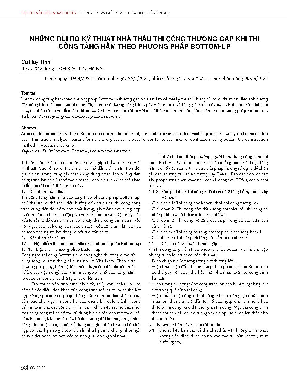 Những rủi ro kỹ thuật nhà thầu thi công thường gặp khi thi công tầng hầm theo phương pháp Bottom-up = Technical risks that construction contractors often encounter when constructing basements according to the Bottom-up method