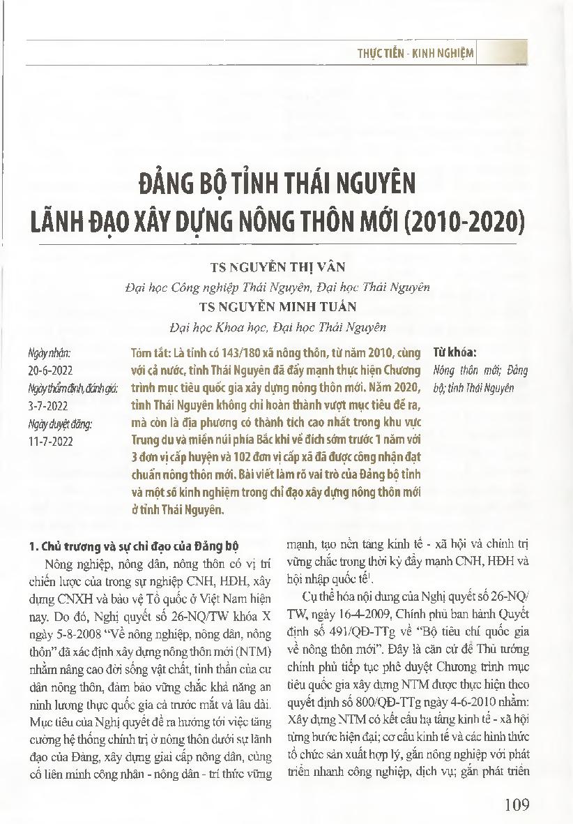 Đảng bộ tỉnh Thái Nguyên lãnh đạo xây dựng nông thôn mới (2010-2020) = Thai Nguyen Provincial Party Committee&; 39;s leadership in building new countryside (2010-2020)