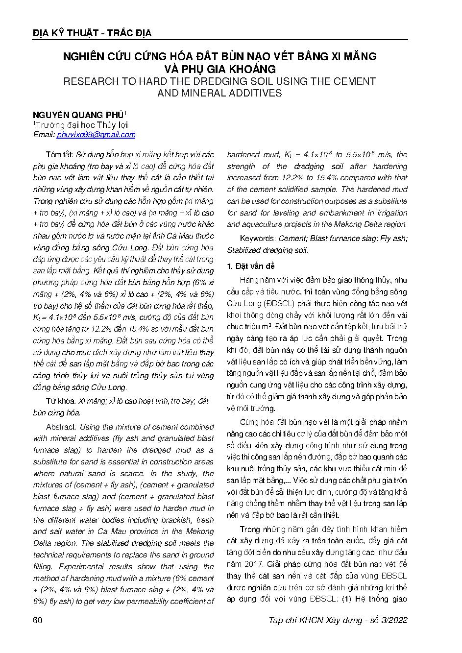 Nghiên cứu cứng hóa đất bùn nạo vét bằng xi măng và phụ gia khoáng = Research to hard the dredging soil using the cement and mineral additives