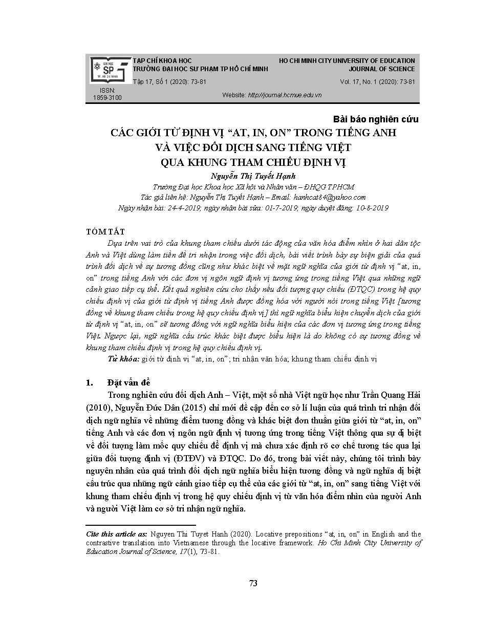 CÁC GIỚI TỪ ĐỊNH VỊ “AT, IN, ON” TRONG TIẾNG ANH VÀ VIỆC ĐỐI DỊCH SANG TIẾNG VIỆT QUA KHUNG THAM CHIẾU ĐỊNH VỊ = LOCATIVE PREPOSITIONS “AT, IN, ON” IN ENGLISH AND THE CONTRASTIVE TRANSLATION INTO VIETNAMESE THROUGH THE LOCATIVE FRAMEWORK