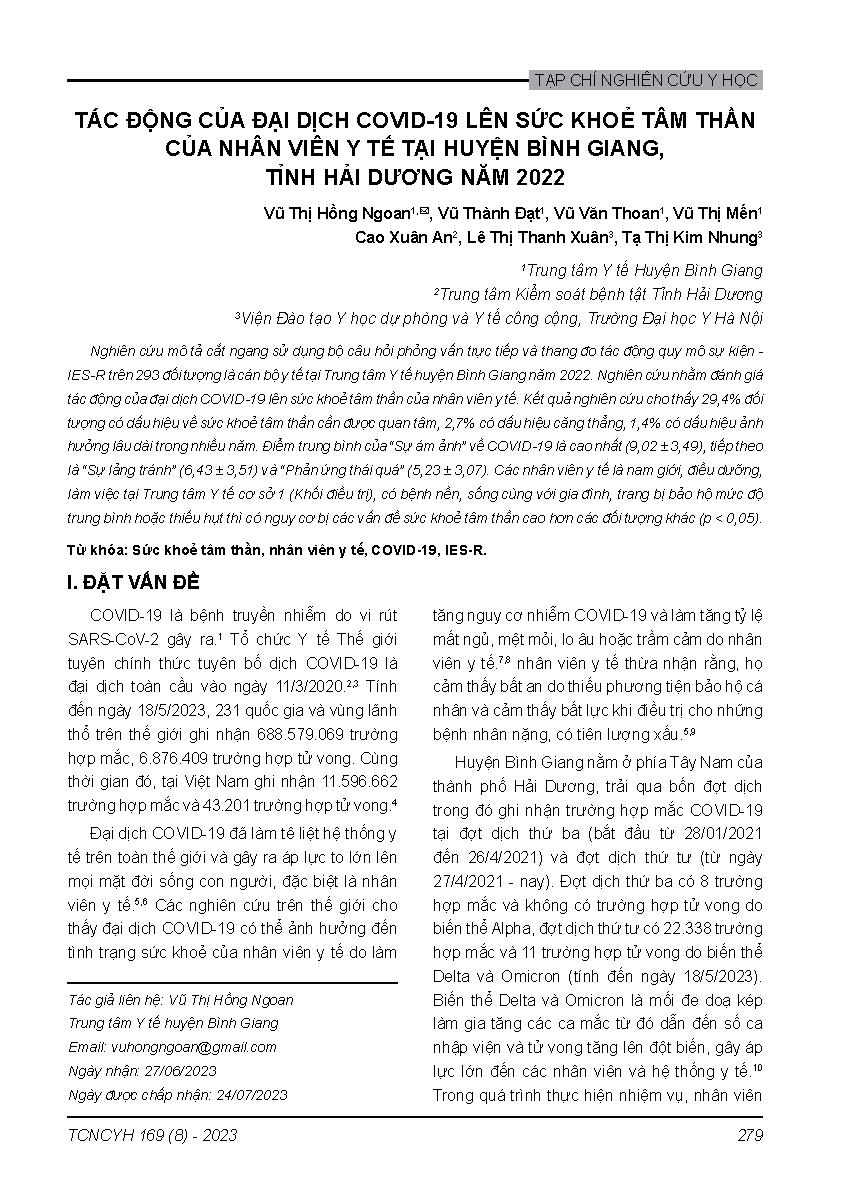 Tác động của đại dịch COVID-19 lên sức khoẻ tâm thần của nhân viên y tế tại huyện Bình Giang, tỉnh Hải Dương năm 2022 = Impact of the COVID-19 pandemic on mental health of medical staff at the medical center of Binh Giang district, Hai Duong province in 2