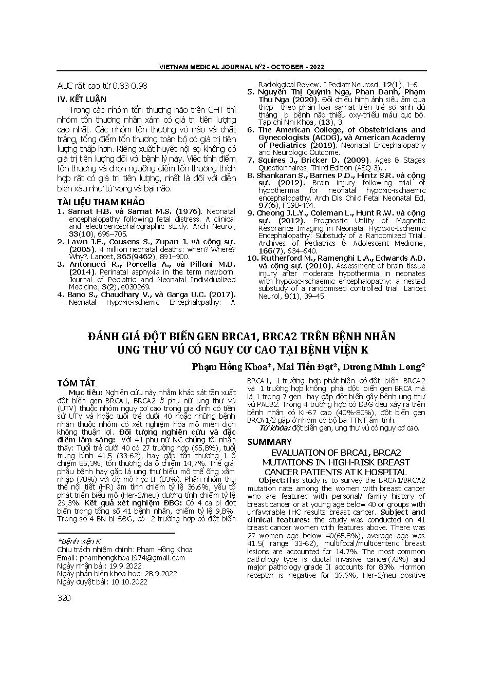 Đánh giá đột biến gen BRCA1, BRCA2 trên bệnh nhân ung thư vú có nguy cơ cao tại Bệnh viện K = Evaluation of BRCA1, BRCA2 mutations in high-risk breast cancer patients at K hospital