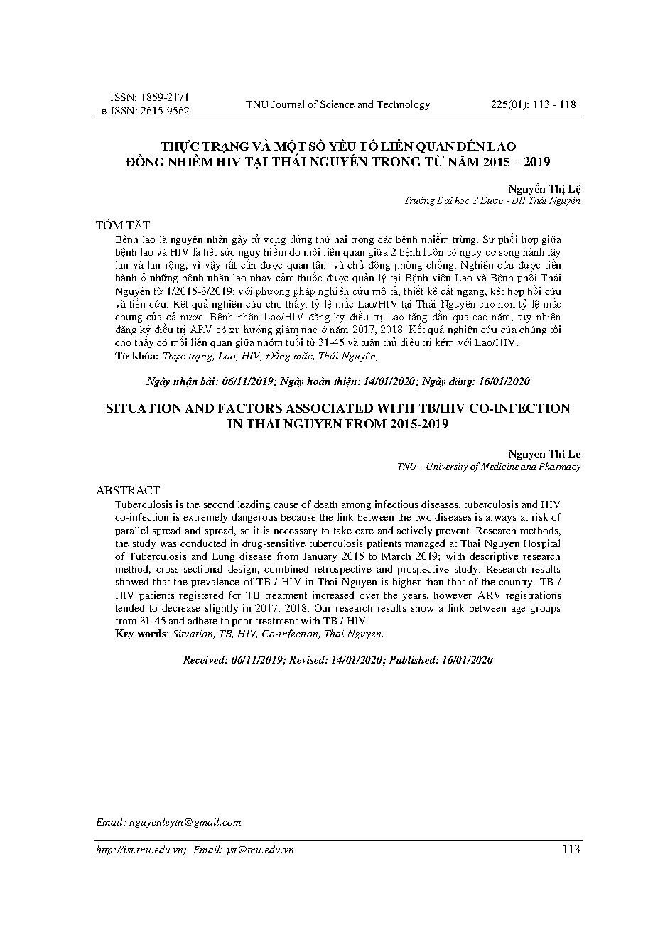 Thực trạng và một số yếu tố liên quan đến lao đồng nhiễm tại Thái Nguyên từ năm 2015-2020 = Situation and factors associated with TB/HIV co-infection in Thai Nguyen from 2015-2019