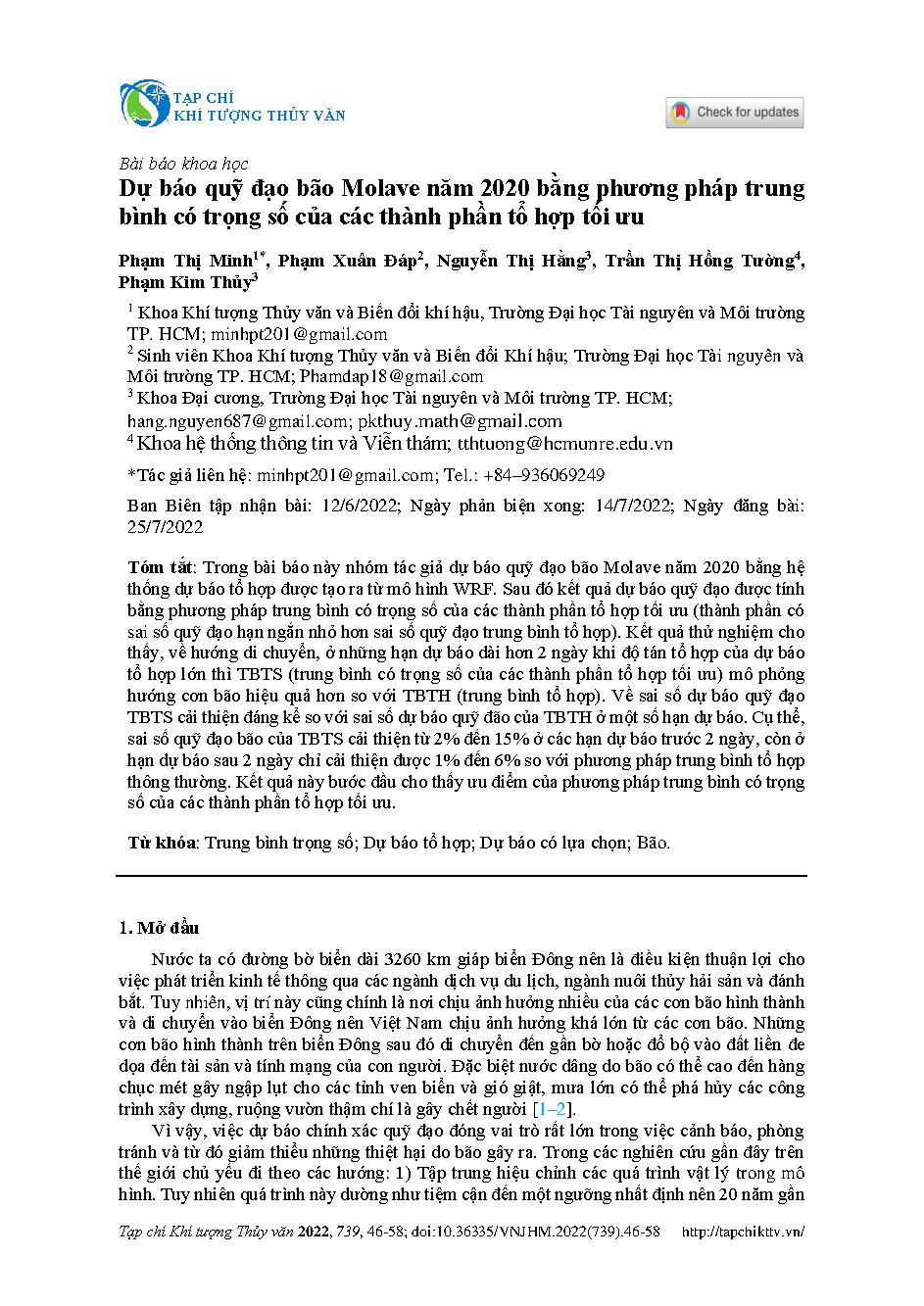 Dự báo quỹ đạo bão Molave năm 2020 bằng phương pháp trung bình có trọng số của các thành phần tổ hợp tối ưu = Forecasting the track Molave storm in 2020 by of the weighted average method of the optimal ensemble members