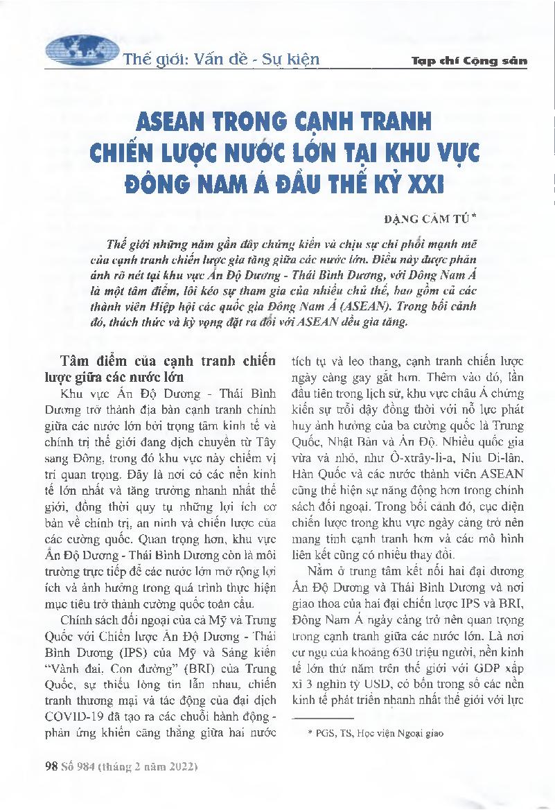 Asean trong cạnh tranh chiến lược nước lớn tại khu vực Đông Nam Á đầu thế kỷ XXI = Asean in strategic competition of great power in Southeast Asia in the early 21st century