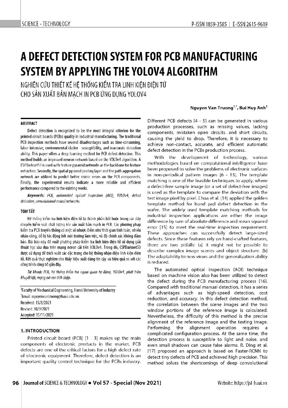 Nghiên cứu thiết kế hệ thống kiểm tra linh kiện điện tử cho sản xuất bản mạch in PCB ứng dụng Yolov4 = A defect detection system for PCB manufacturing system by applying the Yolov4 algorithm