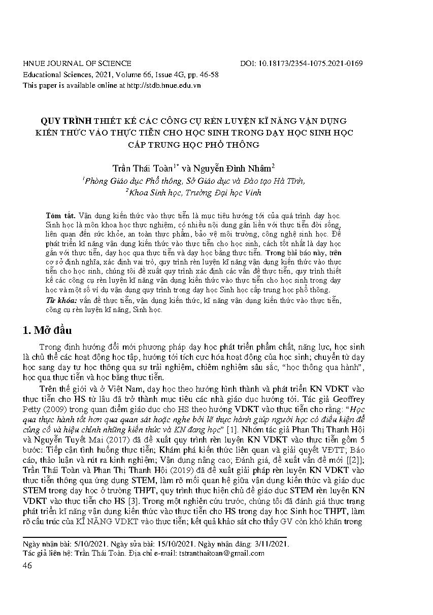 Quy trình thiết kế các công cụ rèn luyện kĩ năng vận dụng kiến thức vào thực tiễn cho học sinh trong dạy học sinh học cấp trung học phổ thông = Process of designing a set tools for training students in skill of applying knowledge into practice in teaching biology at high school