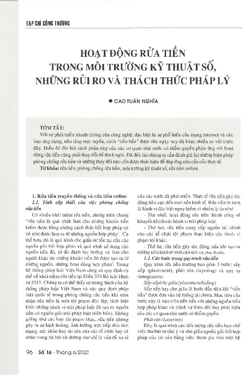 Hoạt động rửa tiền trong môi trường kỹ thuật số, những rủi ro và thách thức pháp lý = Money laundering in the digital environment, legal risks and challenges