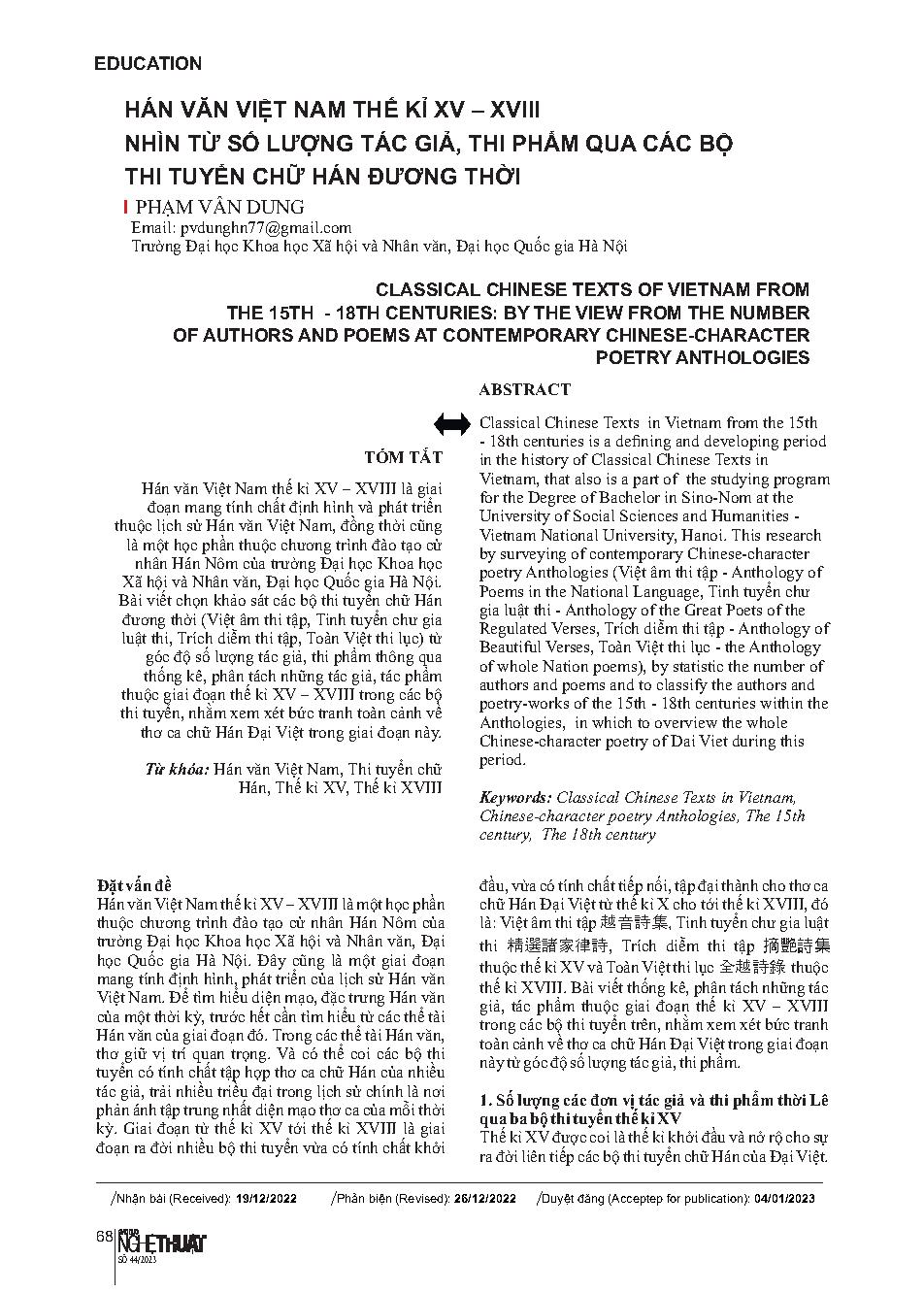 Hán văn Việt Nam thế kỉ XV - XVIII nhìn từ số lượng tác giả, thi phẩm qua các bộ thi tuyển chữ Hán đương thời