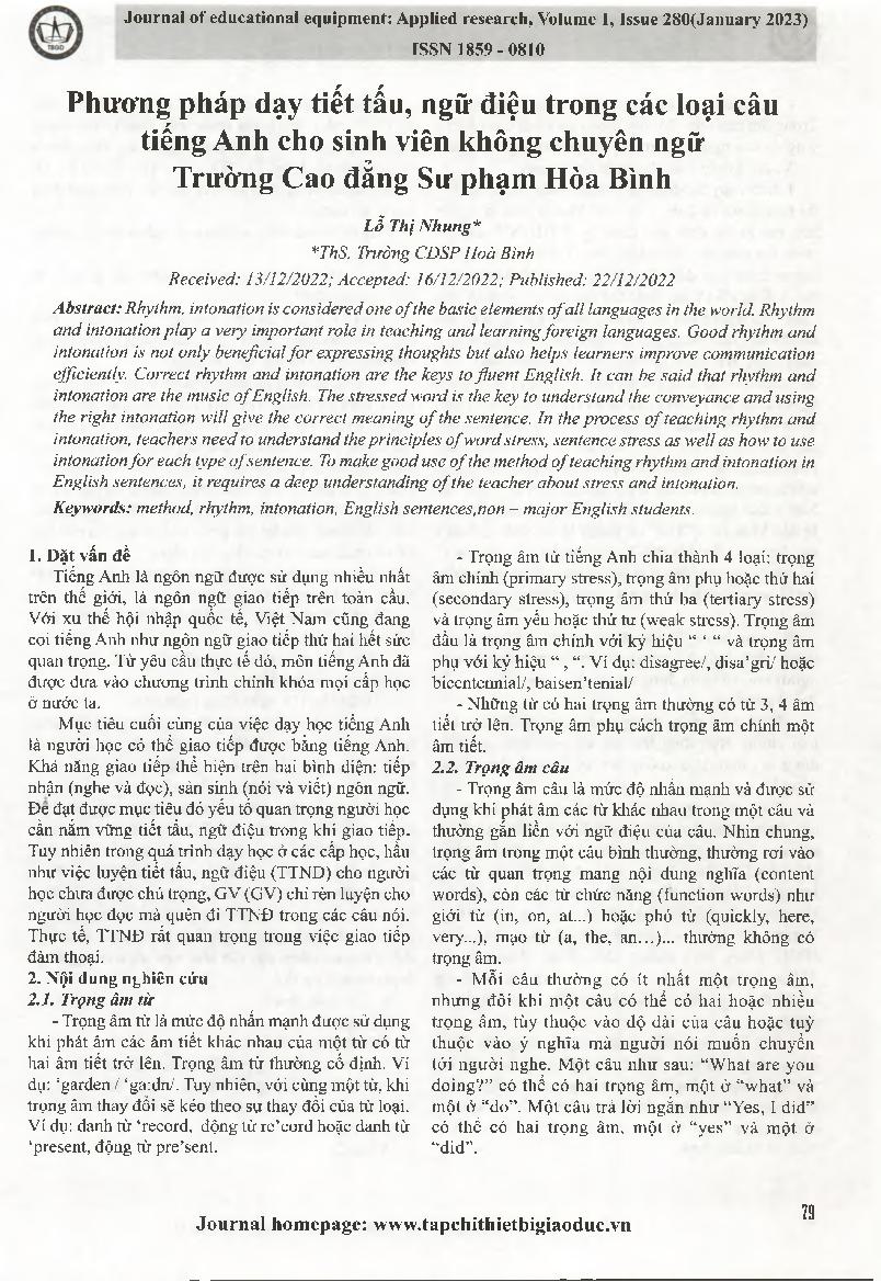 Phương pháp dạy tiết tấu, ngữ điệu trong các loại câu tiếng Anh cho sinh viên không chuyên ngữ Trường Cao đẳng Sư phạm Hòa Bình = Methods of teaching rhythm and intonation in English sentences for non-language major students at Hoa Binh College of Educati