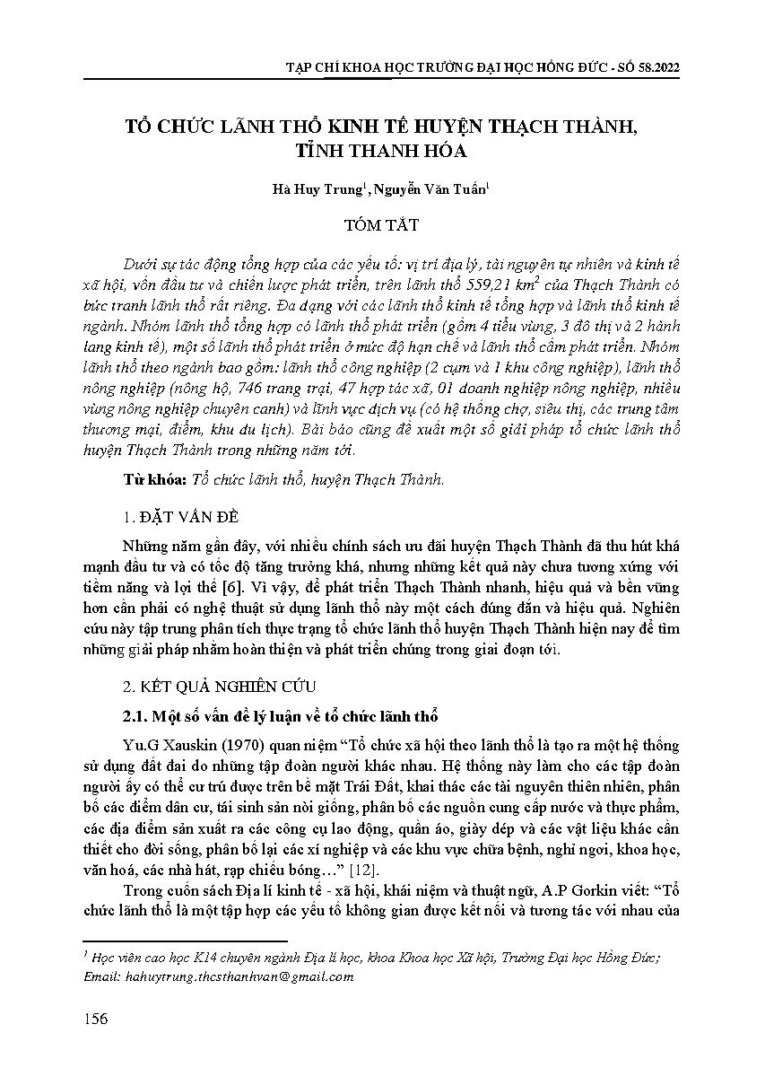 Tổ chức lãnh thổ kinh tế huyện Thạch Thành, tỉnh Thanh Hóa = Territorial organization of Thach Thanh district’s economy of Thanh Hoa province