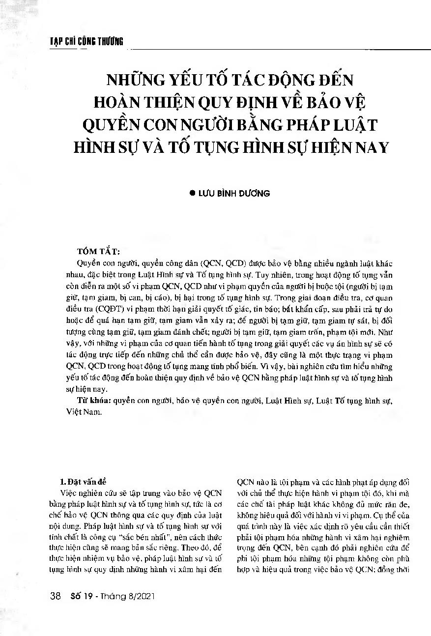 Những yếu tố tác động đến hoàn thiện quy định về bảo vệ quyền con người bằng pháp luật hình sự và tố tụng hình sự hiện nay = Factors affecting the process of completing regulations on human rights and civil rights protection in legal and criminal proceedings