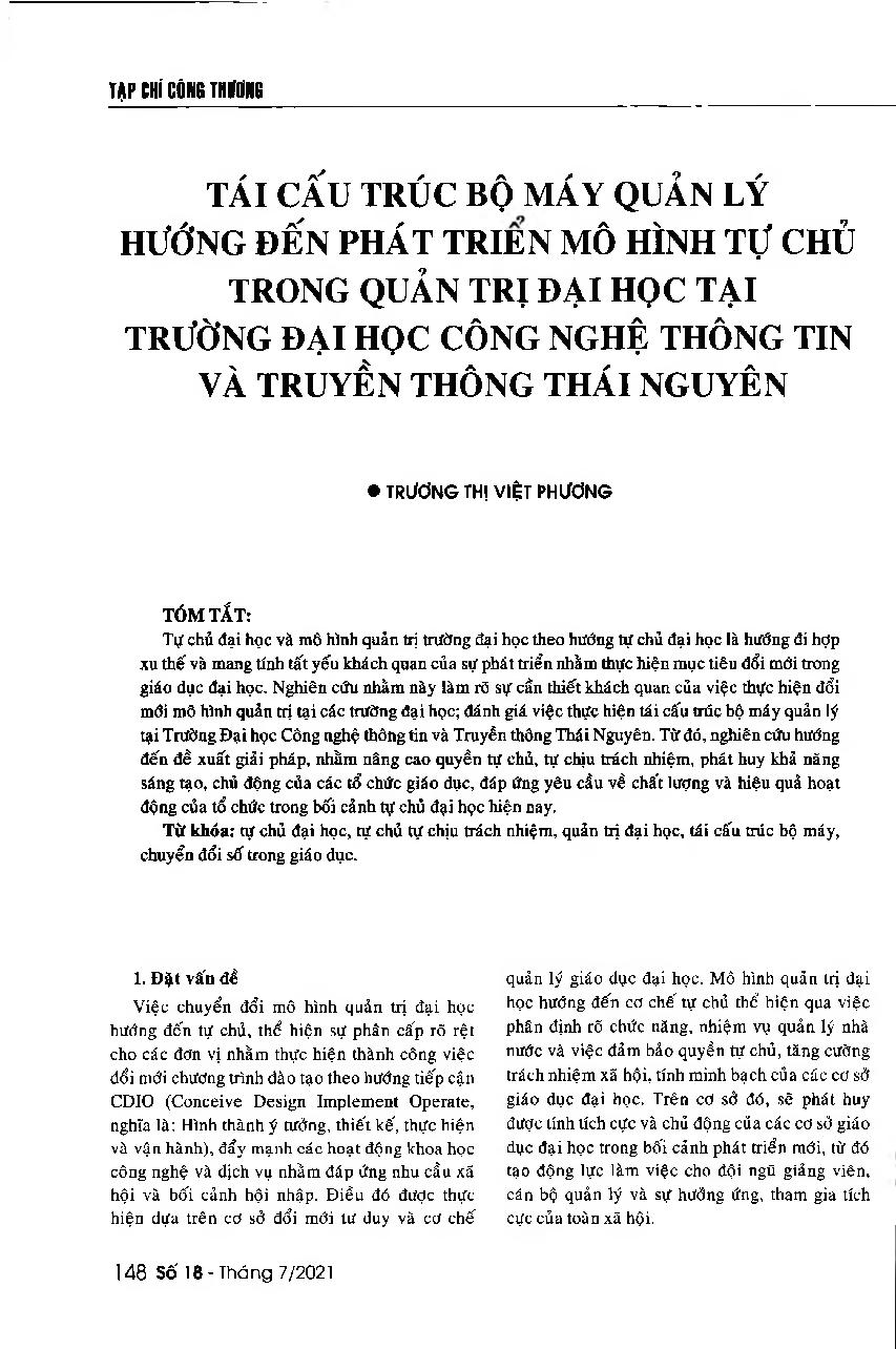 Tái cấu trúc bộ máy quản lý hướng đến phát triển mô hình tự chủ trong quản trị đại học tại Trường Đại học công nghệ Thông tin và Truyền thông Thái Nguyên = Restructuring organization towards university autonomy-based governance model at the University of Information and Communication Technology, Thai Nguyen University