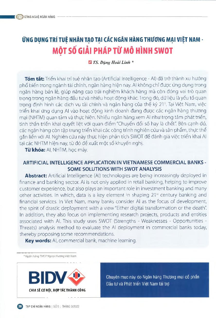 Ứng dụng trí tuệ nhân tạo tại các ngân hàng thương mại Việt Nam - Một số giải pháp từ mô hình SWOT = Application of artificial intelligence in Vietnamese commercial banks - Some solutions from the SWOT model
