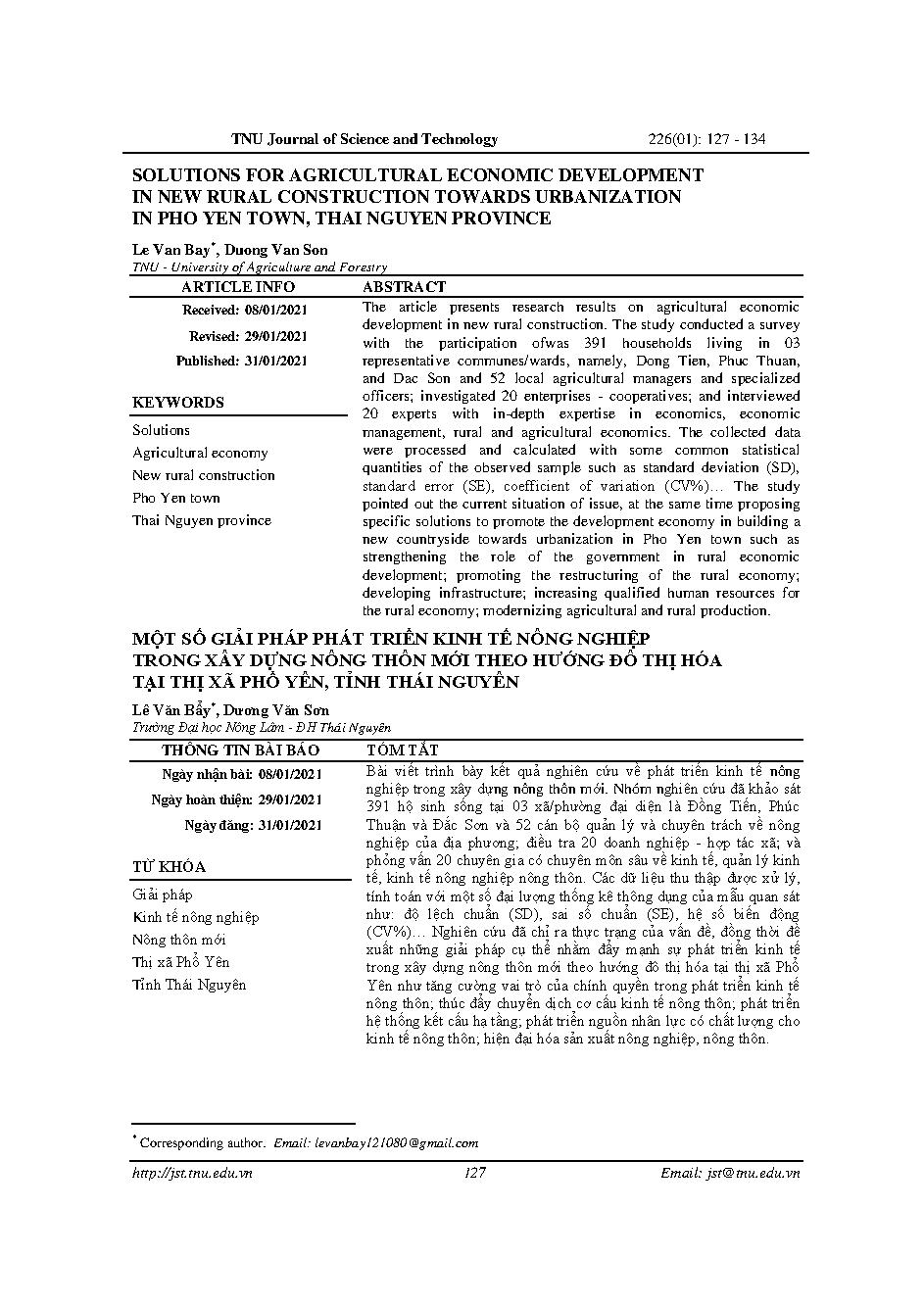 Một số giải pháp phát triển kinh tế nông nghiệp trong xây dựng nông thôn mới theo hướng đô thị hóa tại thị xã Phổ Yên, tỉnh Thái Nguyên = Solutions for agricultural economic development in new rural construction towards urbanization in pho yen town, thai nguyen province