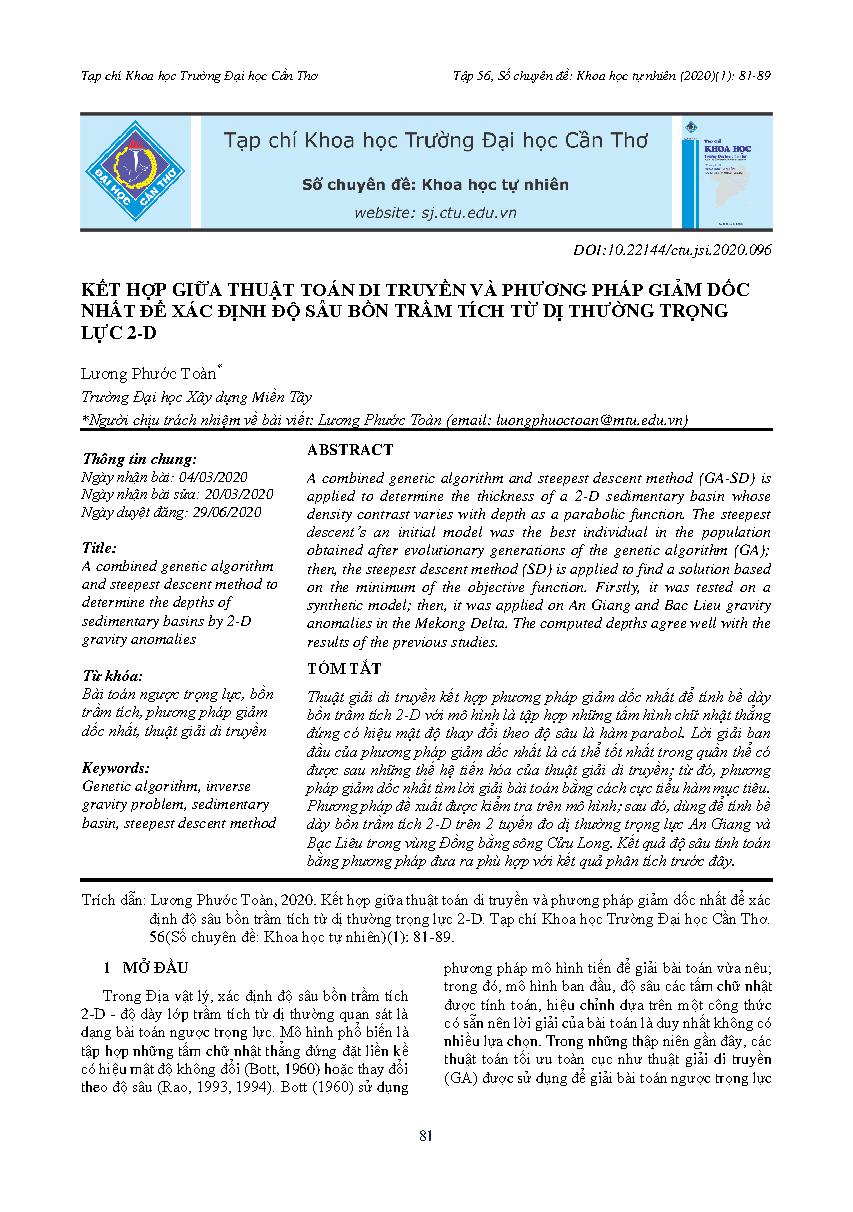 Kết hợp giữa thuật toán di truyền và phương pháp giảm dốc nhất để xác định độ sâu bồn trầm tích từ dị thường trọng lực 2-D = A combined genetic algorithm and steepest descent method to determine the depths of sedimentary basins by 2-D gravity anomalies