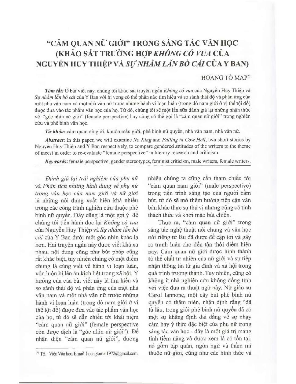 “Cảm quan nữ giới” trong sáng tác văn học (khảo sát trường hợp Không có vua của Nguyễn Huy Thiệp và Sự nhầm lẫn bò cái của Y Ban)