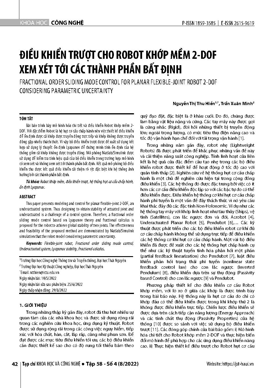 Điều khiển trượt cho robot khớp mềm 2-DOF xem xét tới các thành phần bất định = Fractional order sliding mode control for planar flexible-joint robot 2-DOF considering parametric uncertainty