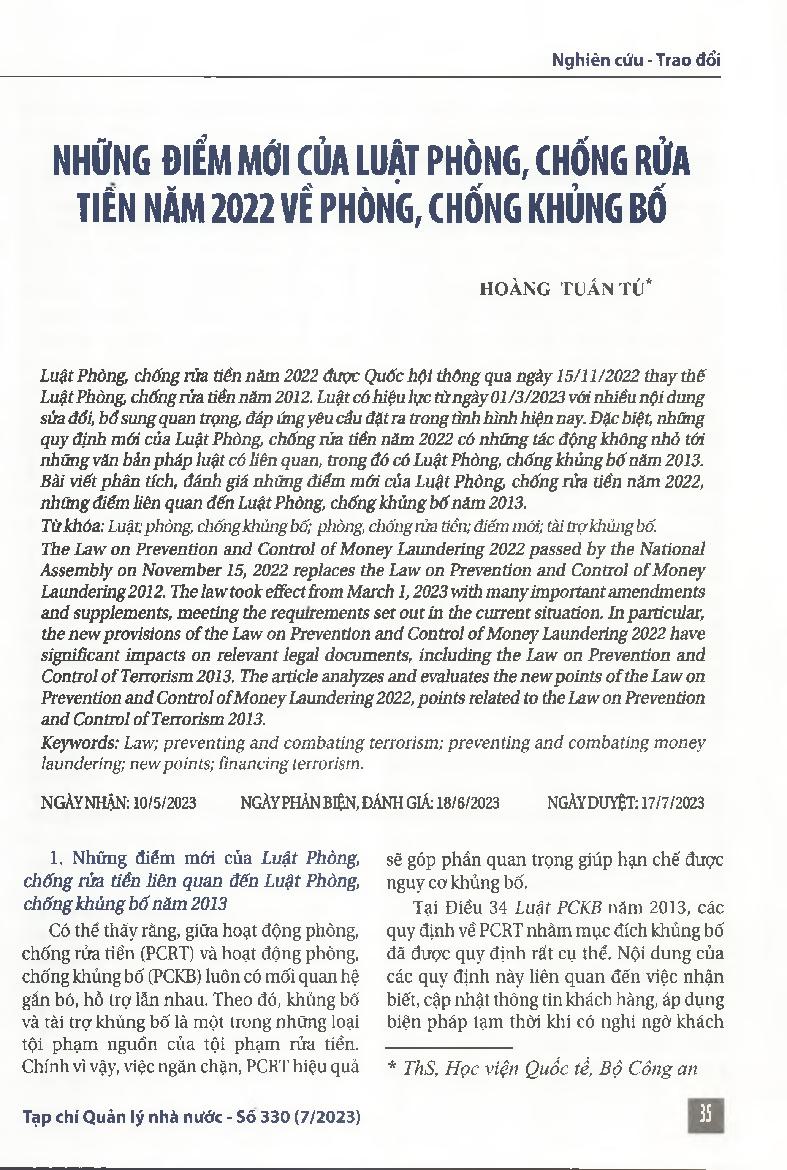 Những điểm mới của Luật Phòng, chống rửa tiền năm 2022 về phòng, chống khủng bố = New points of the Law on Prevention and Combat of Money Laundering 2022 on prevention and combat of terrorism