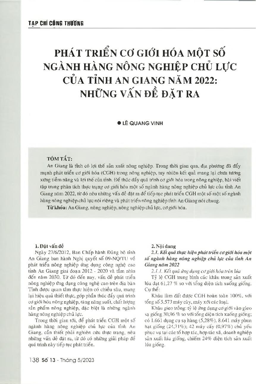 Phát triển cơ giới hóa một số ngành hàng nông nghiệp chủ lực của tỉnh An Giang năm 2022 - Những vấn đề đặt ra