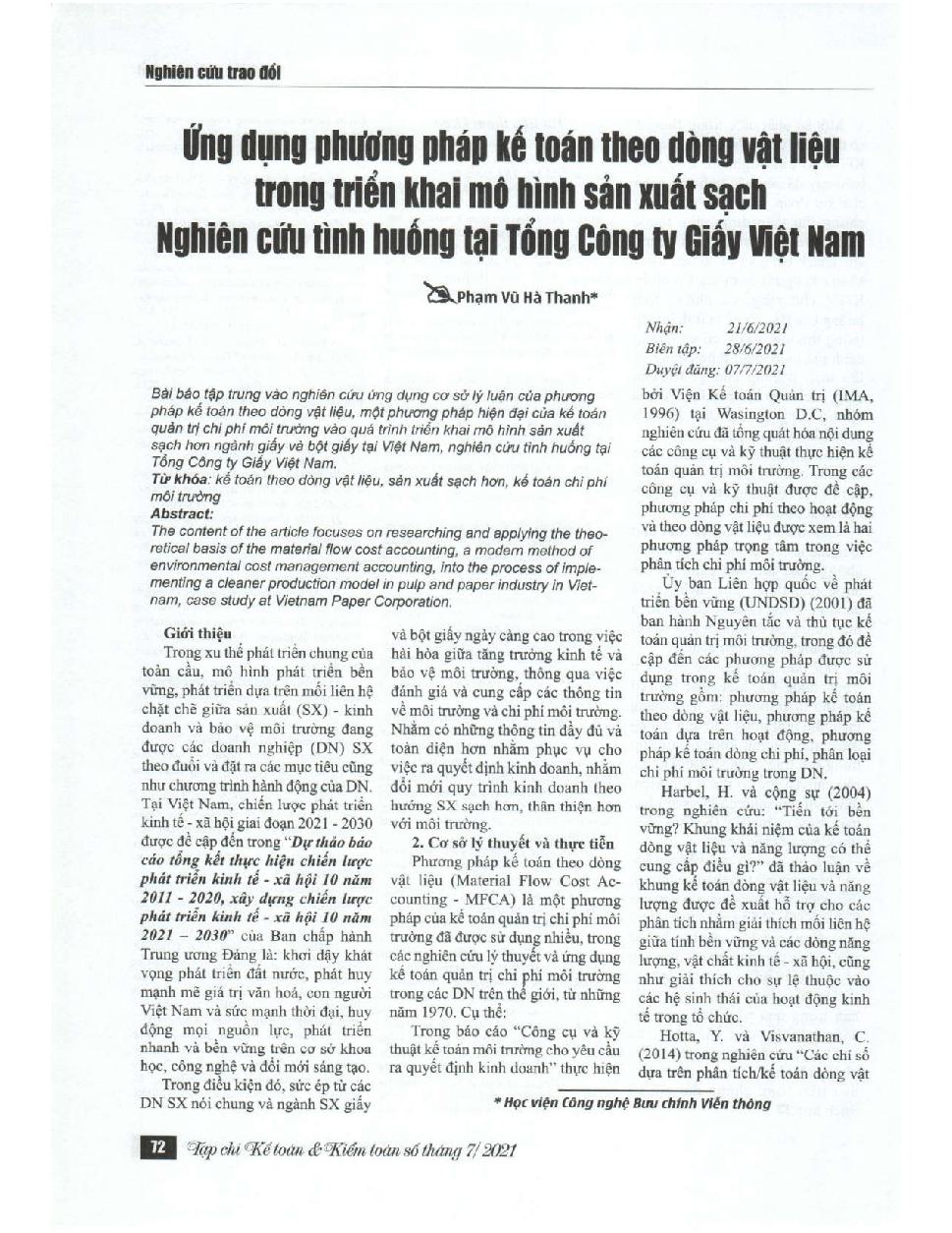 Ứng dụng phương pháp kế toán theo dòng vật liệu trong triển khai mô hình sản xuất sạch Nghiên cứui tình huống tại Tổng Công ty Giấy Việt Nam