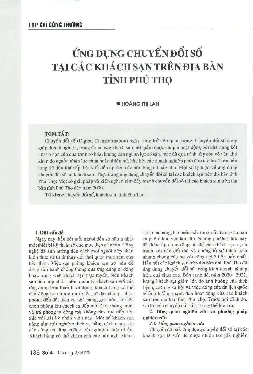 Ứng dụng chuyển đổi số tại các khách sạn trên địa bàn tỉnh Phú Thọ = The application of digital transformation at hotels in Phu Tho province