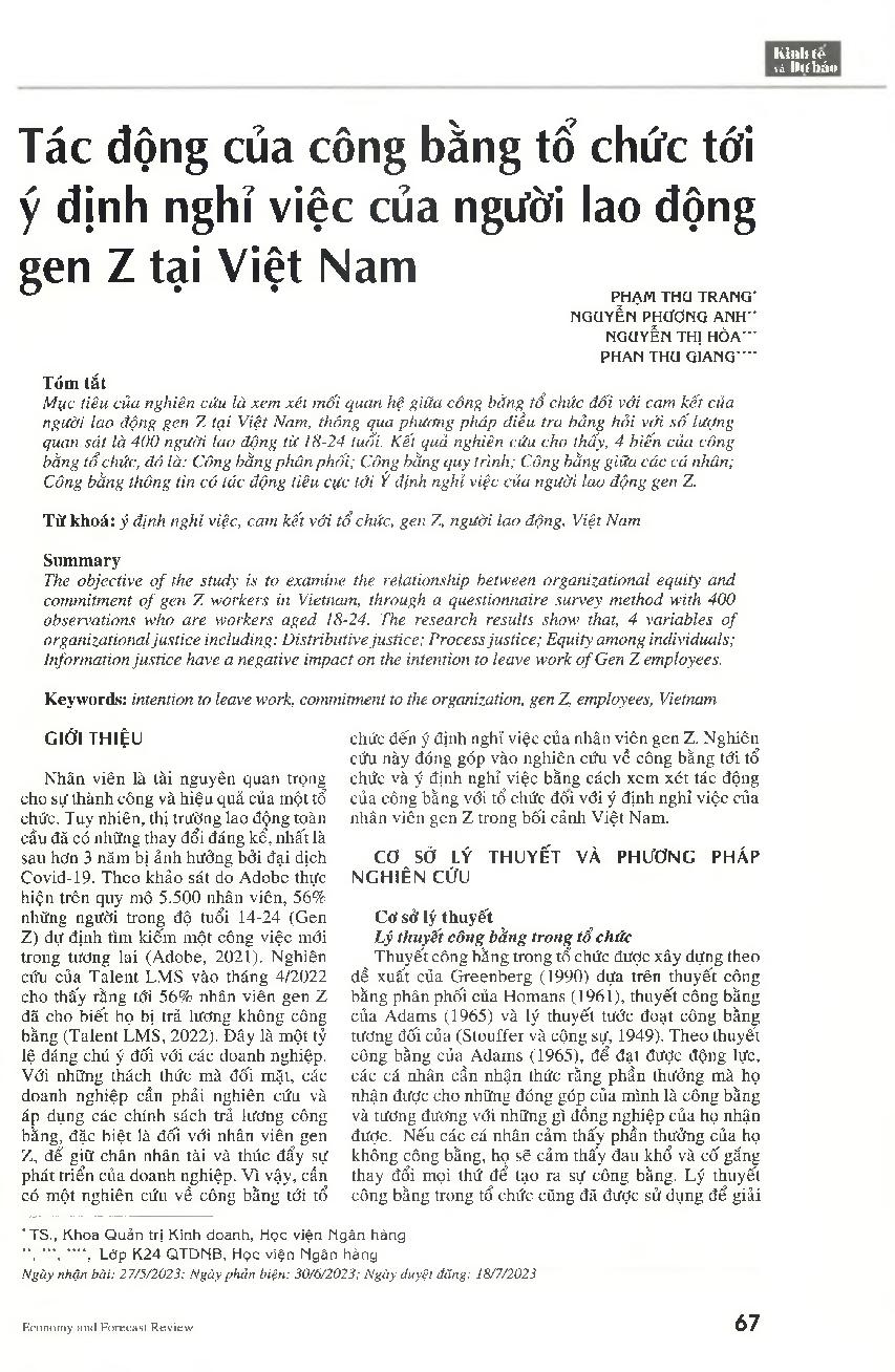 Tác động của công bằng tổ chức tới ý định nghỉ việc của người lao động gen Z tại Việt Nam