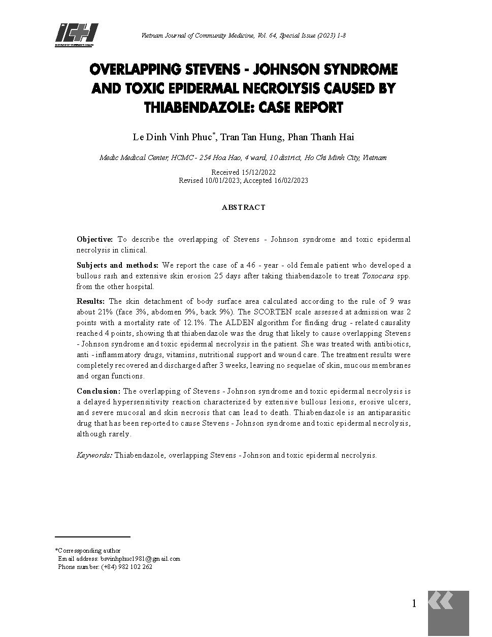 Chồng lấp hội chứng Stevens - Johnson và hoại tử thượng bì nhiễm độc do thuốc Thiabendazole: trường hợp lâm sàng = Overlapping Stevens - Johnson syndrome and toxic epidermal necrolysis caused by thiabendazole: case report
