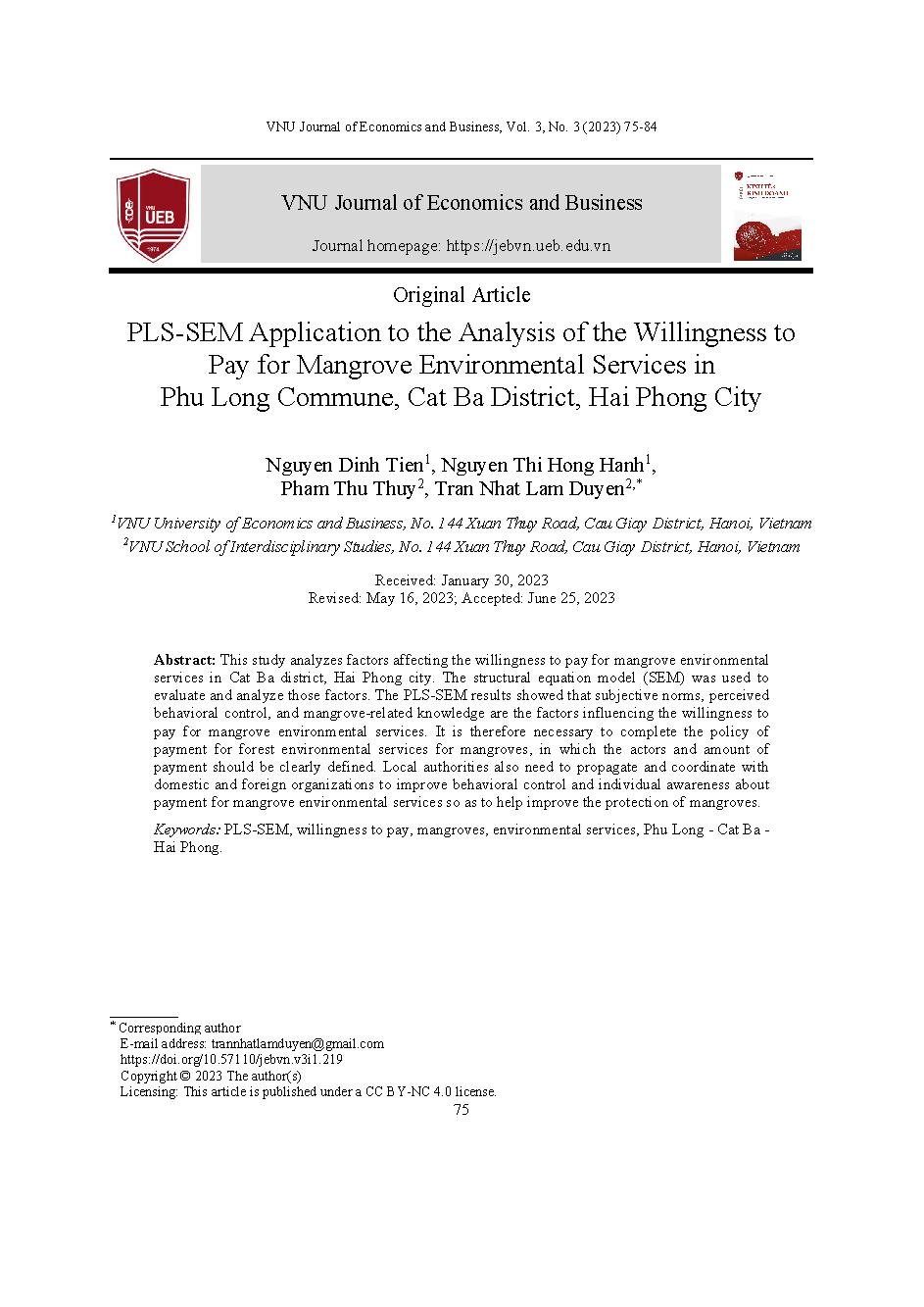 Ứng dụng PLS-SEM trong phân tích sự sẵn lòng chi trả dịch vụ môi trường rừng ngập mặn tại xã Phù Long, huyện Cát Bà, thành phố Hải Phòng = PLS-SEM Application to the Analysis of the Willingness to Pay for Mangrove Environmental Services in Phu Long Commun