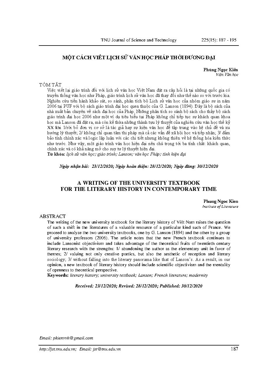 Một cách viết lịch sử văn học Pháp thời đương đại = A writing of the university textbook for the literary history in contemporary time