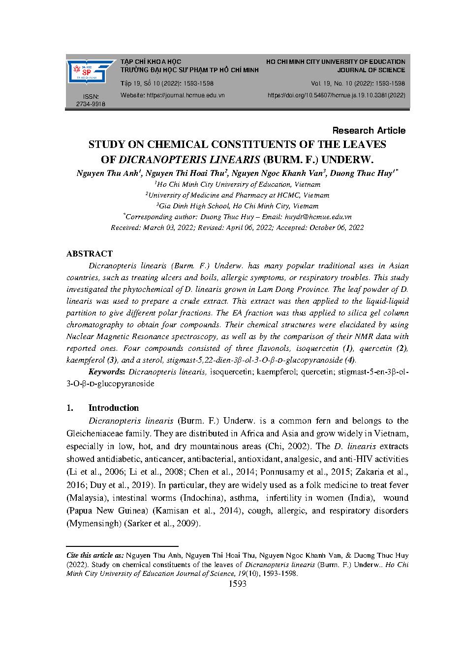 Nghiên cứu thành phần hóa học của lá cây ráng tây sơn Dicranopteris linearis (burm. f.) Underw = Study on chemical constituents of the leaves of dicranopteris linearis (burm. f.) underw.