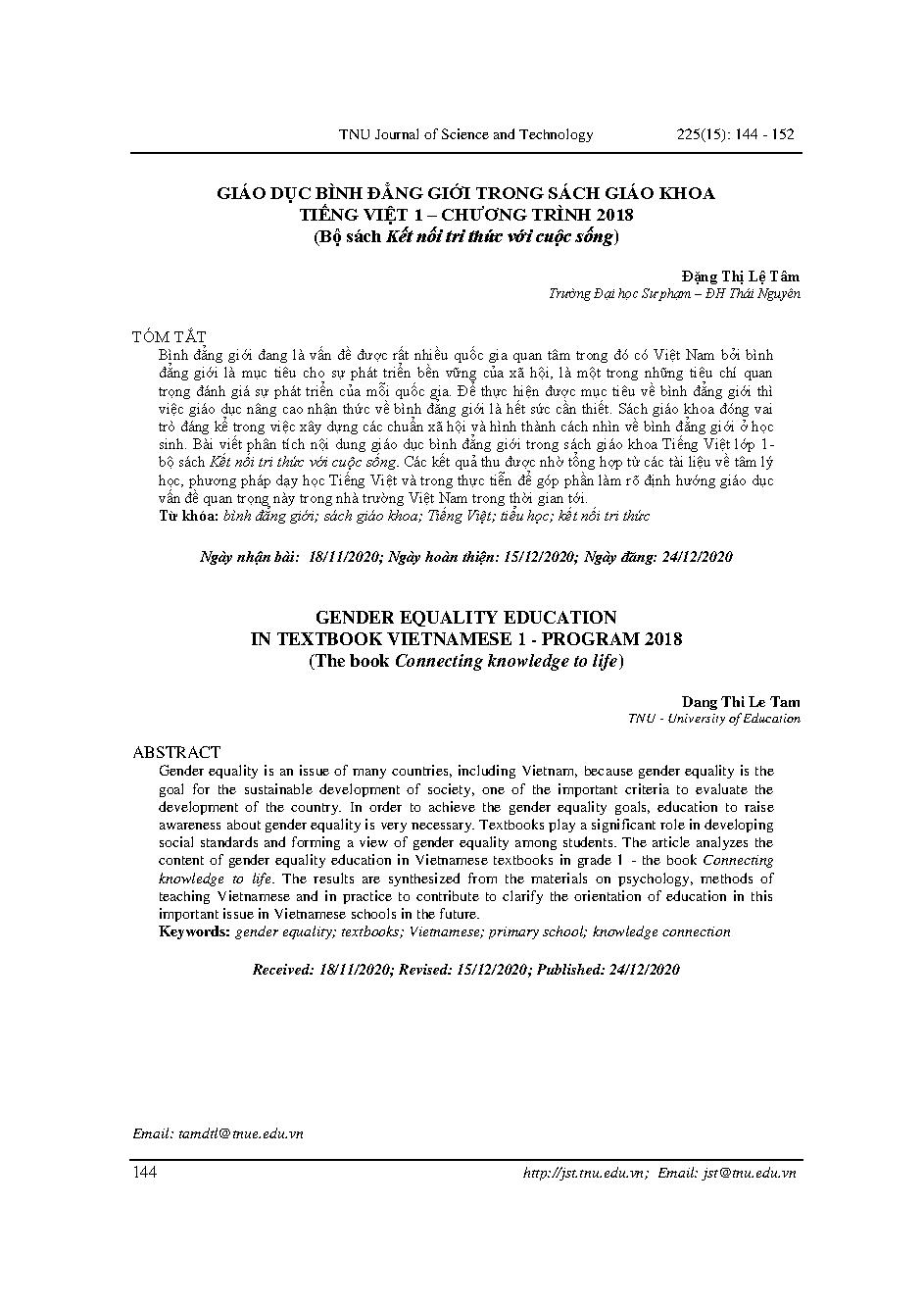 Giáo dục bình đẳng giới trong sách giáo khoa tiếng Việt 1 – Chương trình 2018 (Bộ sách Kết nối tri thức với cuộc sống) = Gender equality education in textbook Vietnamese 1 - program 2018 (The book Connecting knowledge to life)
