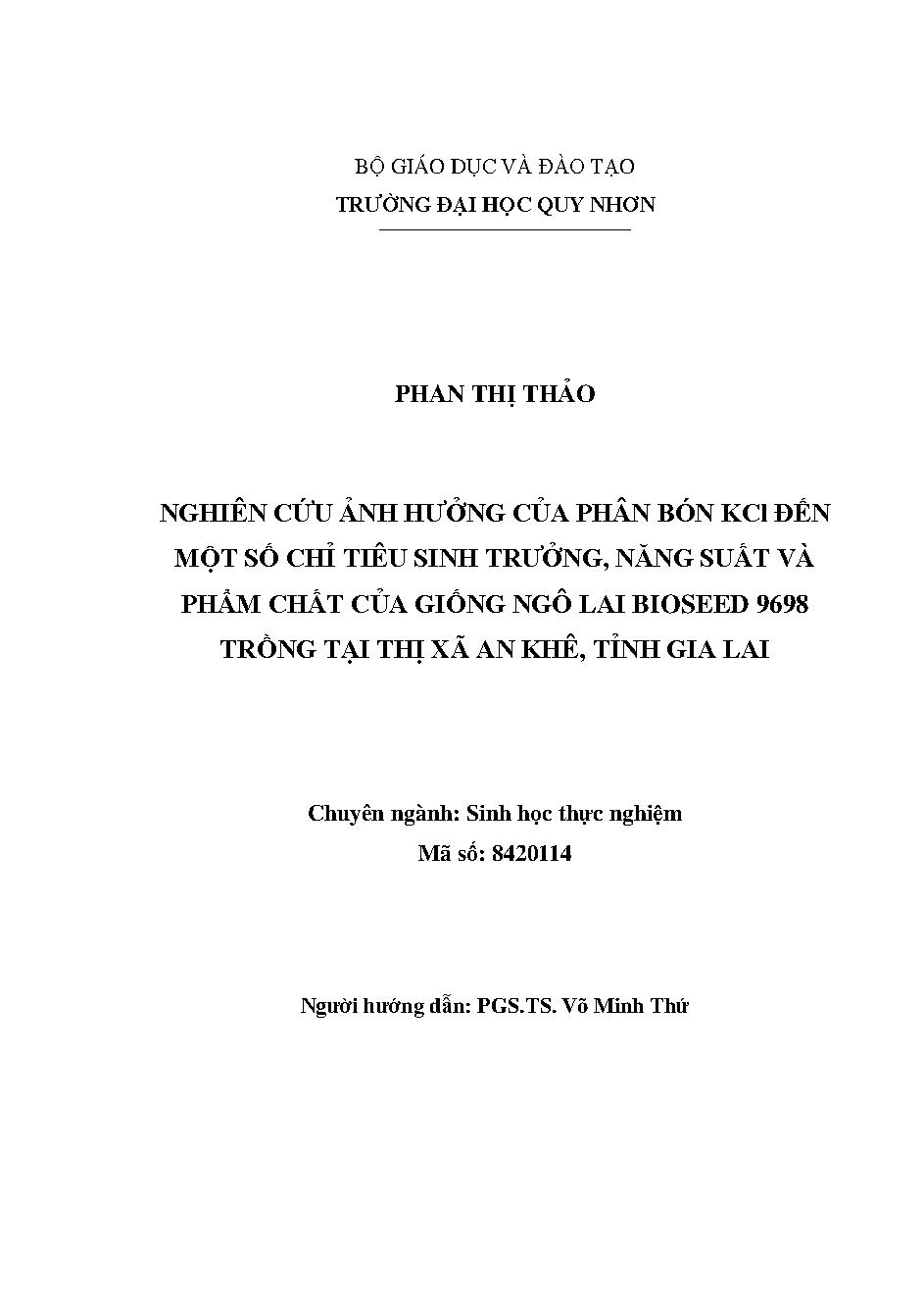 Nghiên cứu ảnh hưởng của phân bón KCl đến một số chỉ tiêu sinh trưởng, năng suất và phẩm chất của giống ngô lai Bioseed 9698 trồng tại thị xã An Khê, tỉnh Gia Lai