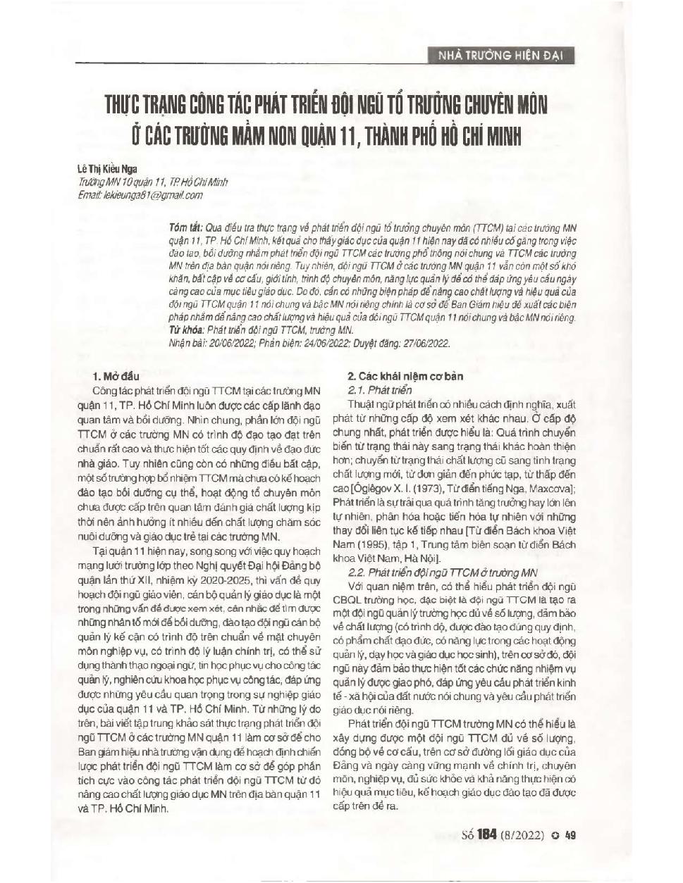 Thực trạng công tác phát triển đội ngũ tổ trưởng chuyên môn ở các trường mầm non quận 11, TP. Hồ Chí Minh
