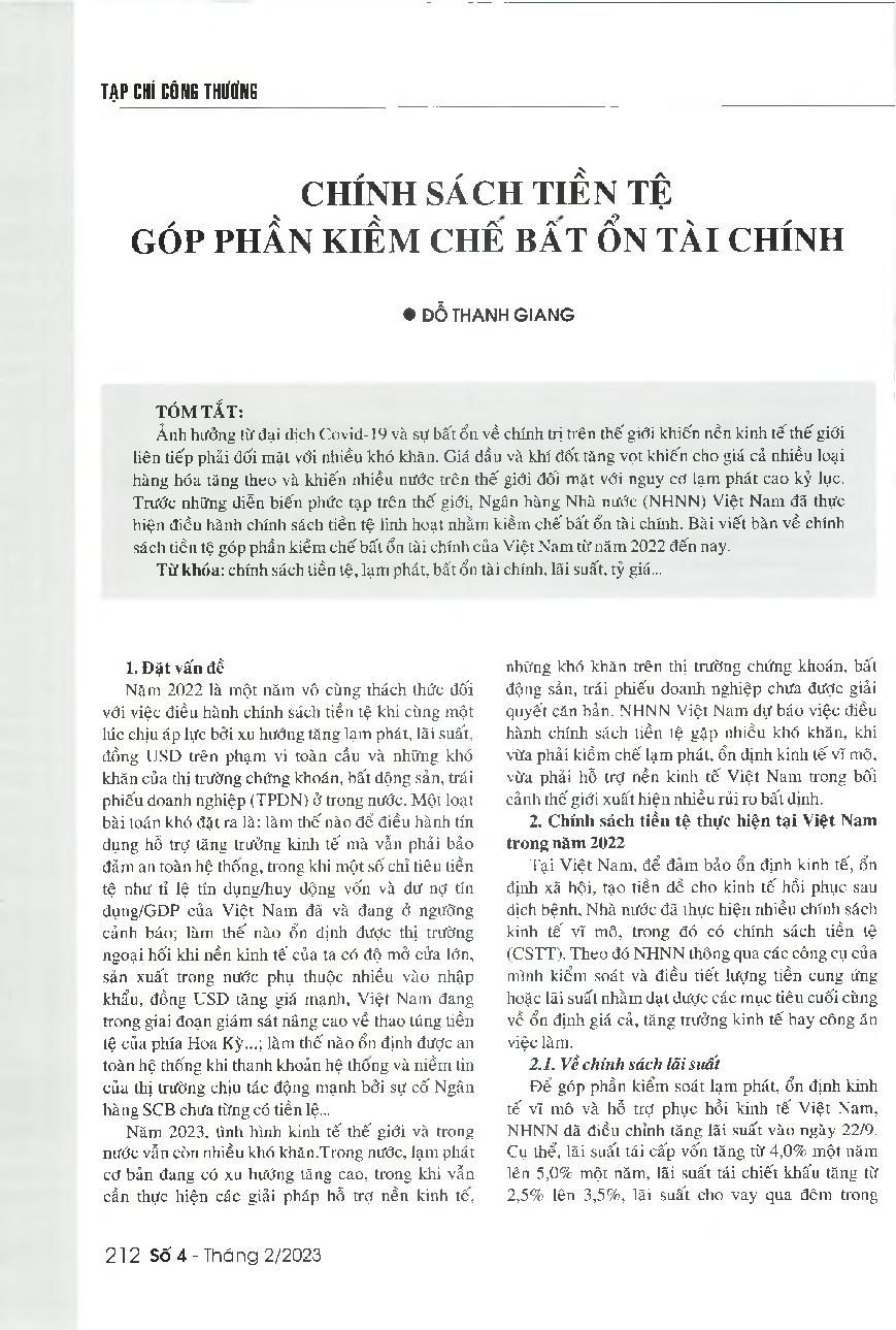 Chính sách tiền tệ góp phần kiềm chế bất ổn tài chính = The monetary policy contributing to curb the financial instability in Vietnam