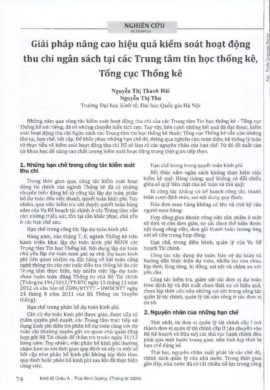 Giải pháp nâng cao hiệu quả kiểm soát hoạt động thu chi ngân sách tại các Trung tâm tin học thống kê, Tổng cục Thống kê