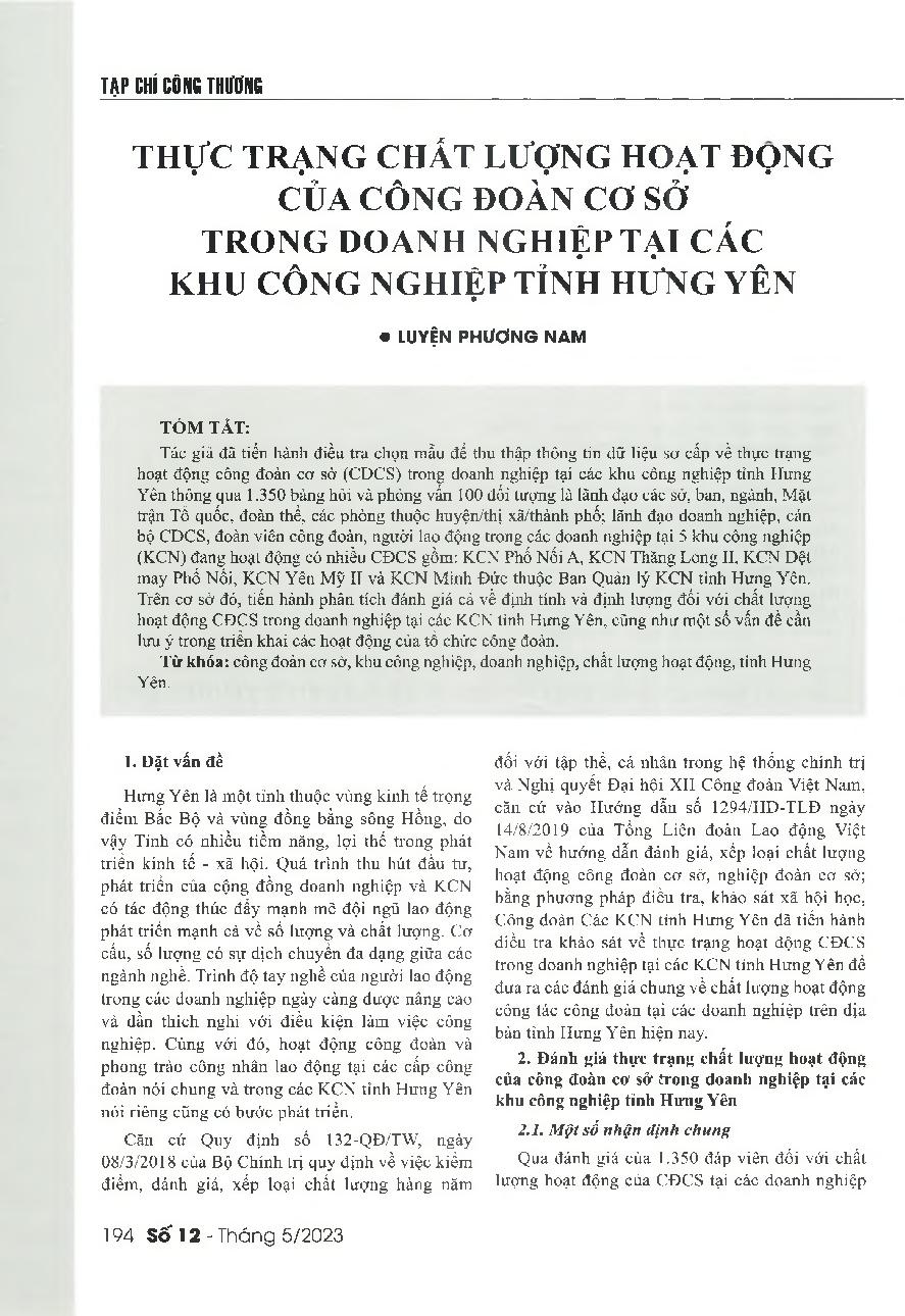 Thực trạng chất lượng hoạt động của công đoàn cơ sở trong doanh nghiệp tại các khu công nghiệp tỉnh Hưng Yên