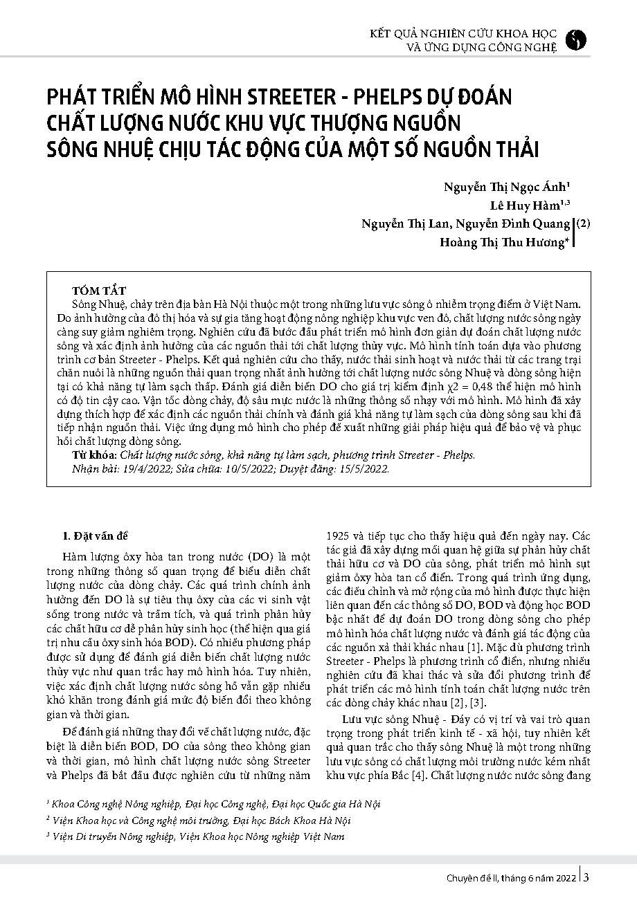 Phát triển mô hình Streeter - Phelps dự đoán chất lượng nước khu vực thượng nguồn sông Nhuệ chịu tác động của một số nguồn thải = The development of computation model to estimate the effect of point source discharge and waste load on water quality in ups