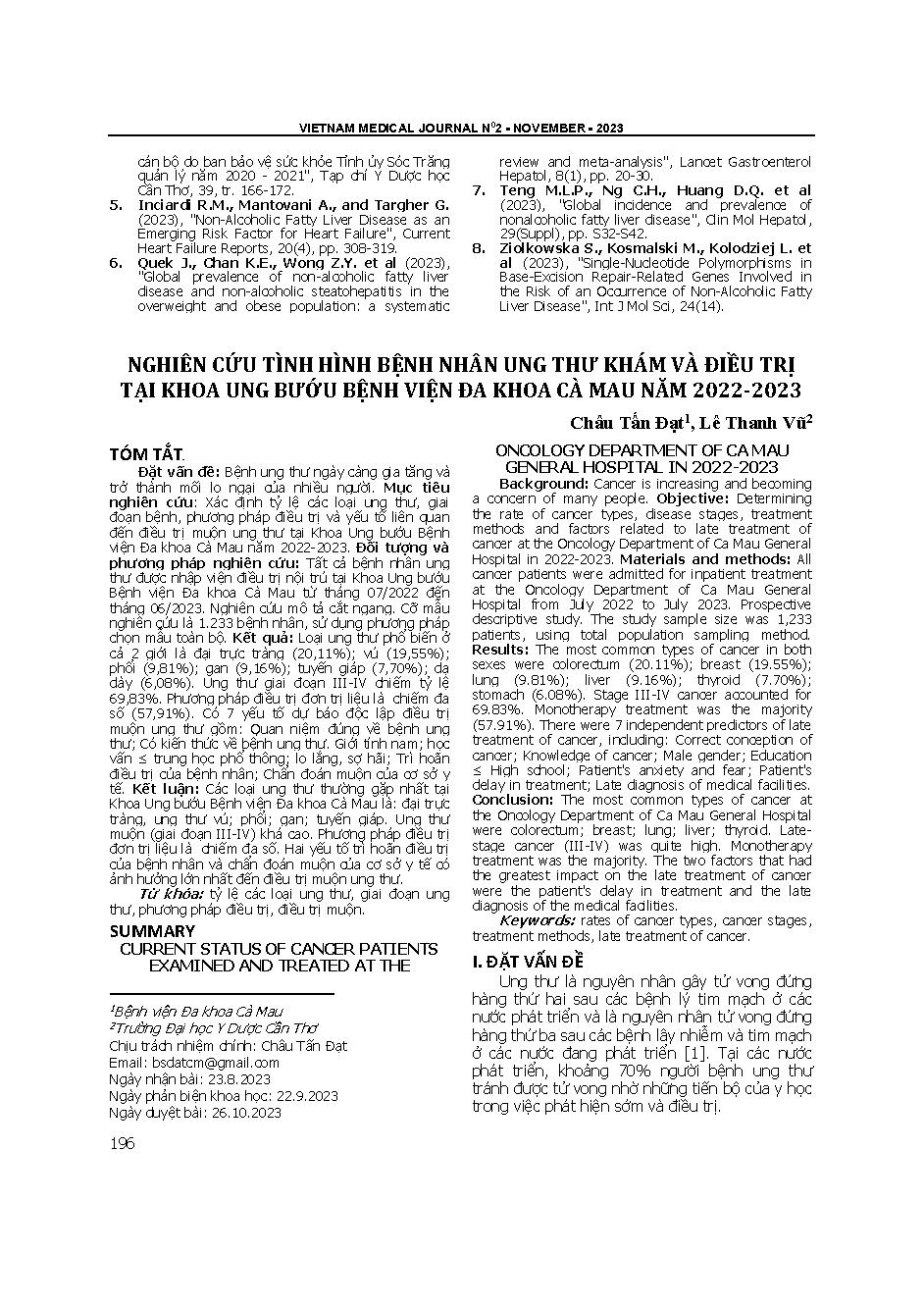 Nghiên cứu tình hình bệnh nhân ung thư khám và điều trị tại Khoa Ung bướu Bệnh viện Đa khoa Cà Mau năm 2022-2023 = Current status of cancer patients examined and treated at the oncology department of Ca Mau general hospital in 2022-2023