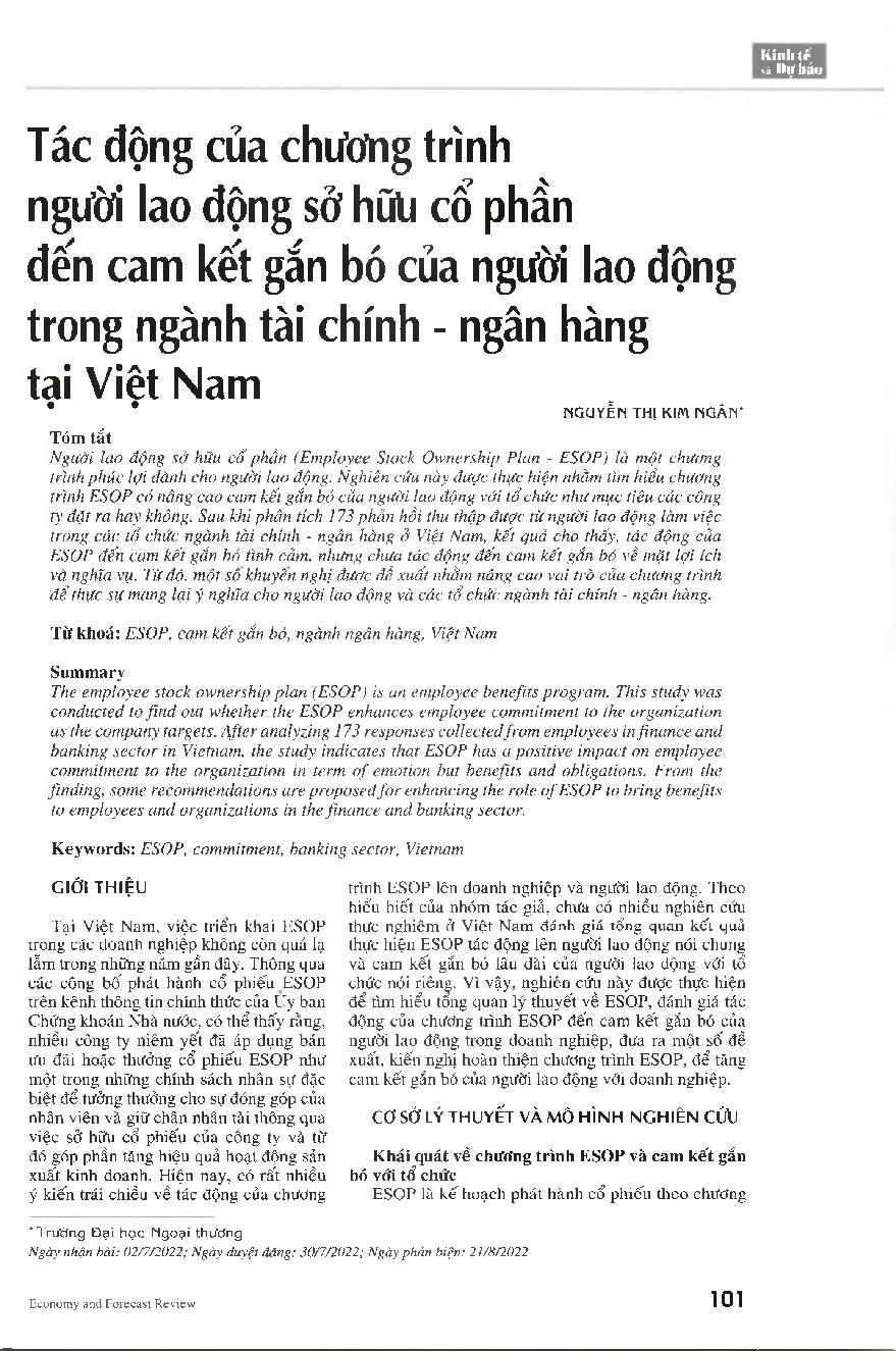 Tác động của chương trình người lao động sở hữu cổ phần đến cam kết gắn bó của người lao động trong ngành tài chính - ngân hàng tại Việt Nam = Impact of employee stock ownership plan on employee commitment to the banking and finance sector in Vietnam