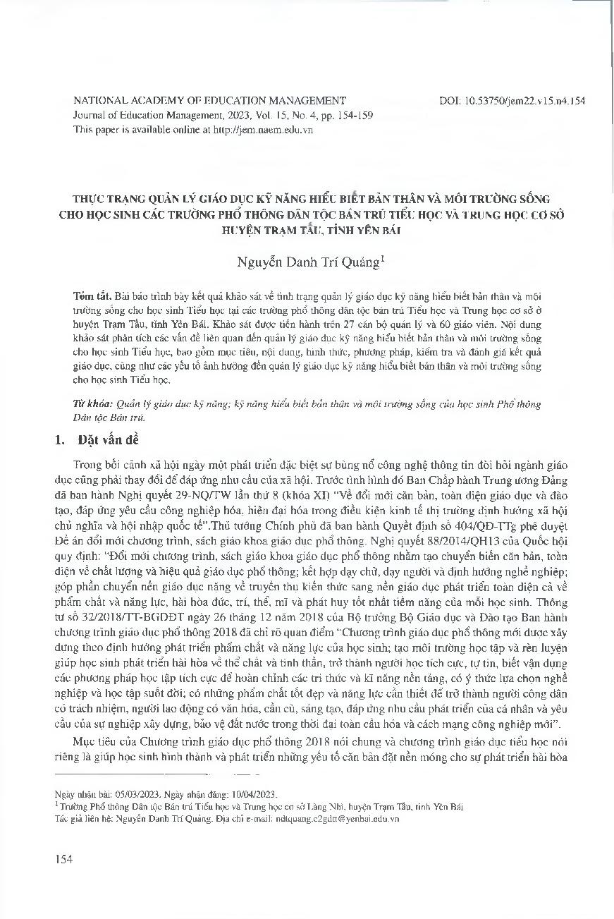 Thực trạng quản lý giáo dục kỹ năng hiểu biết bản thân và môi trường sống cho học sinh các trường phổ thông dân tộc bán trú tiểu học và trung học cơ sở huyện Trạm Tấu, tỉnh Yên Bái = The current situation of educational management of self and environmenta