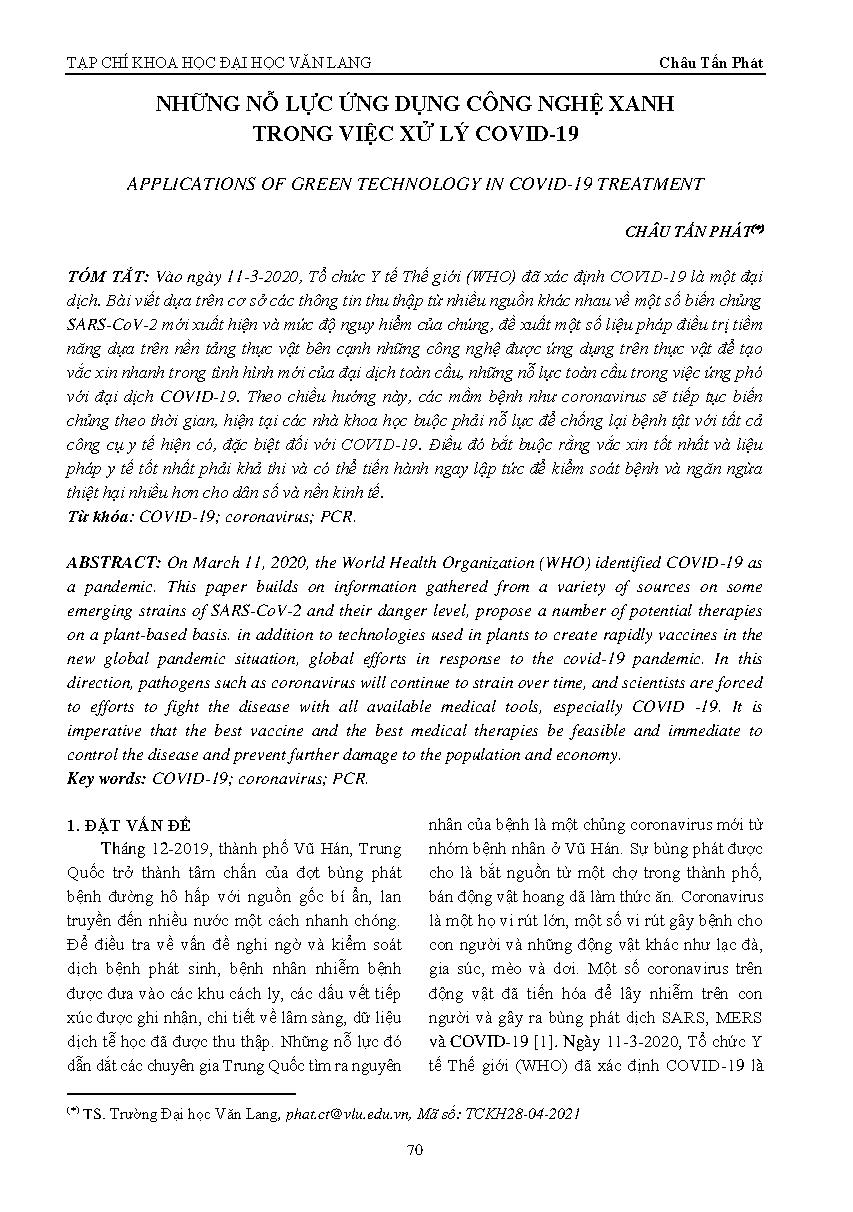 Những nỗ lực ứng dụng công nghệ xanh trong việc xử lý Covid-19 = Applications of green technology in Covid-19 treatment