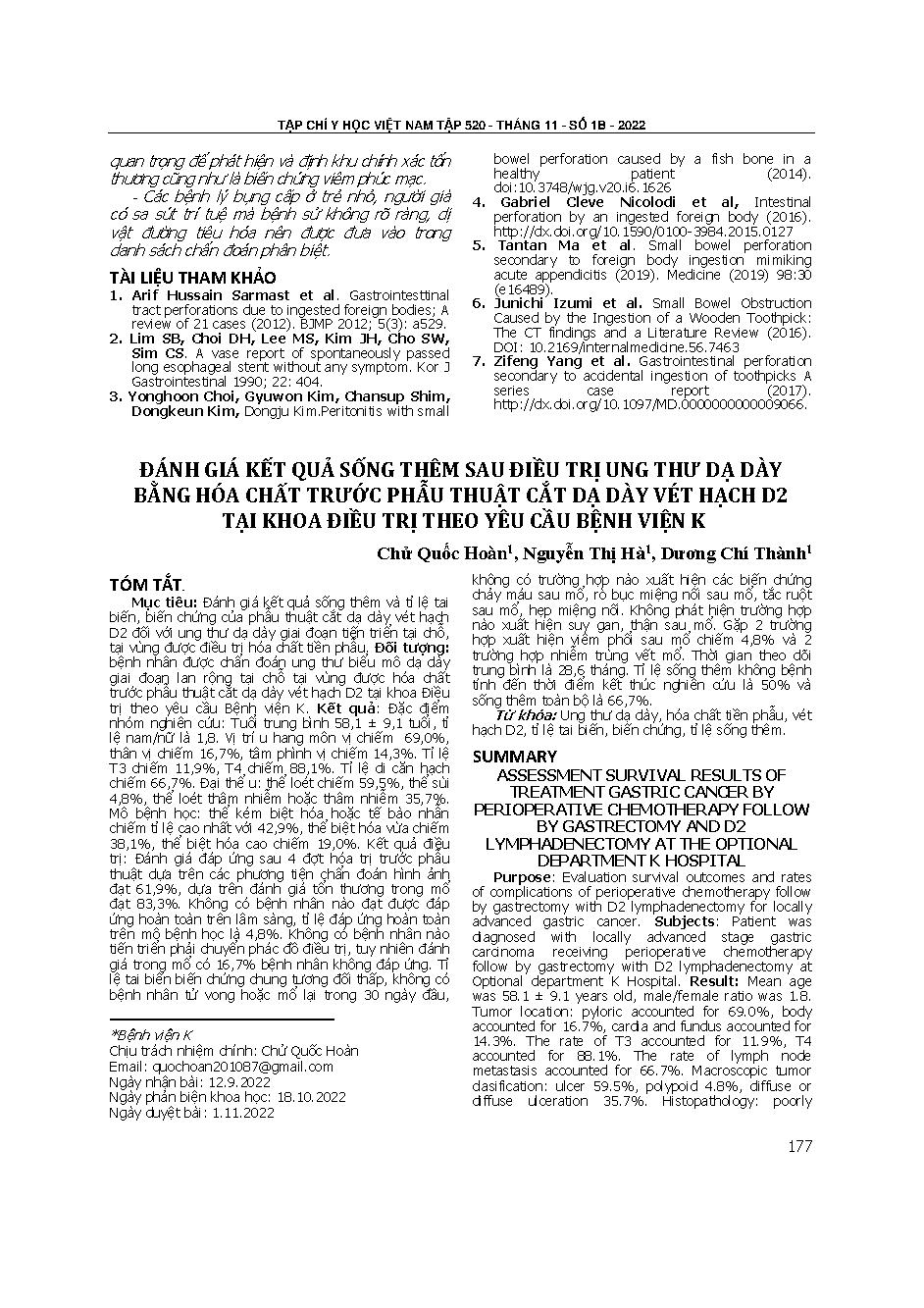 Đánh giá kết quả sống thêm sau điều trị ung thư dạ dày bằng hóa chất trước phẫu thuật cắt dạ dày vét hạch D2 tại Khoa Điều trị theo yêu cầu Bệnh viện K = Assessment survival results of treatment gastric cancer by perioperative chemotherapy follow by gastr