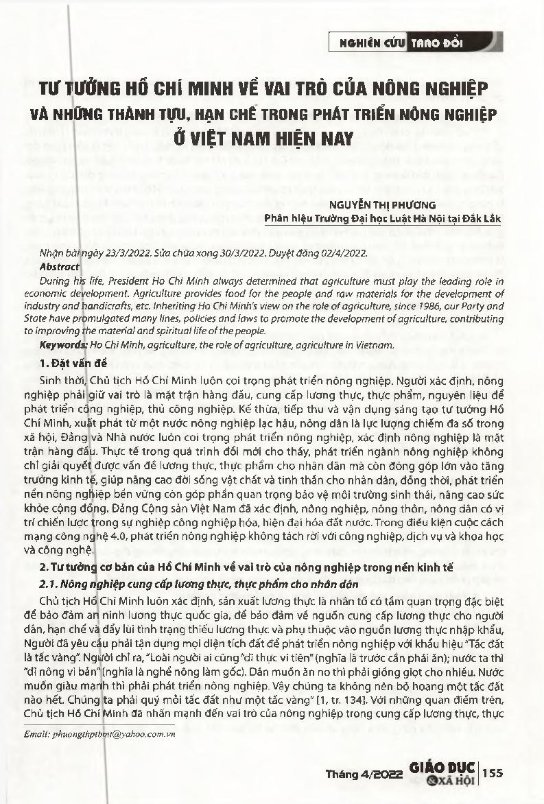 Tư tưởng Hồ Chí Minh về vai trò của nông nghiệp và những thành tựu, hạn chế trong phát triển nông nghiệp ở Việt Nam hiện nay = Ho Chi Minhs thought on the role of agriculture and today&; 39;s achievements, limitations in agricultural development in Vietnam