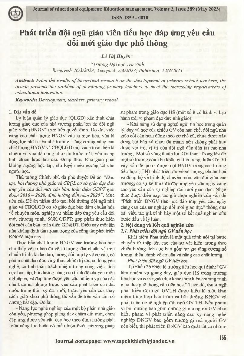 Phát triển đội ngũ giáo viên tiểu học đáp ứng yêu cầu đổi mới giáo dục phổ thông = Developing a team of primary school teachers to meet the requirements of general education reform