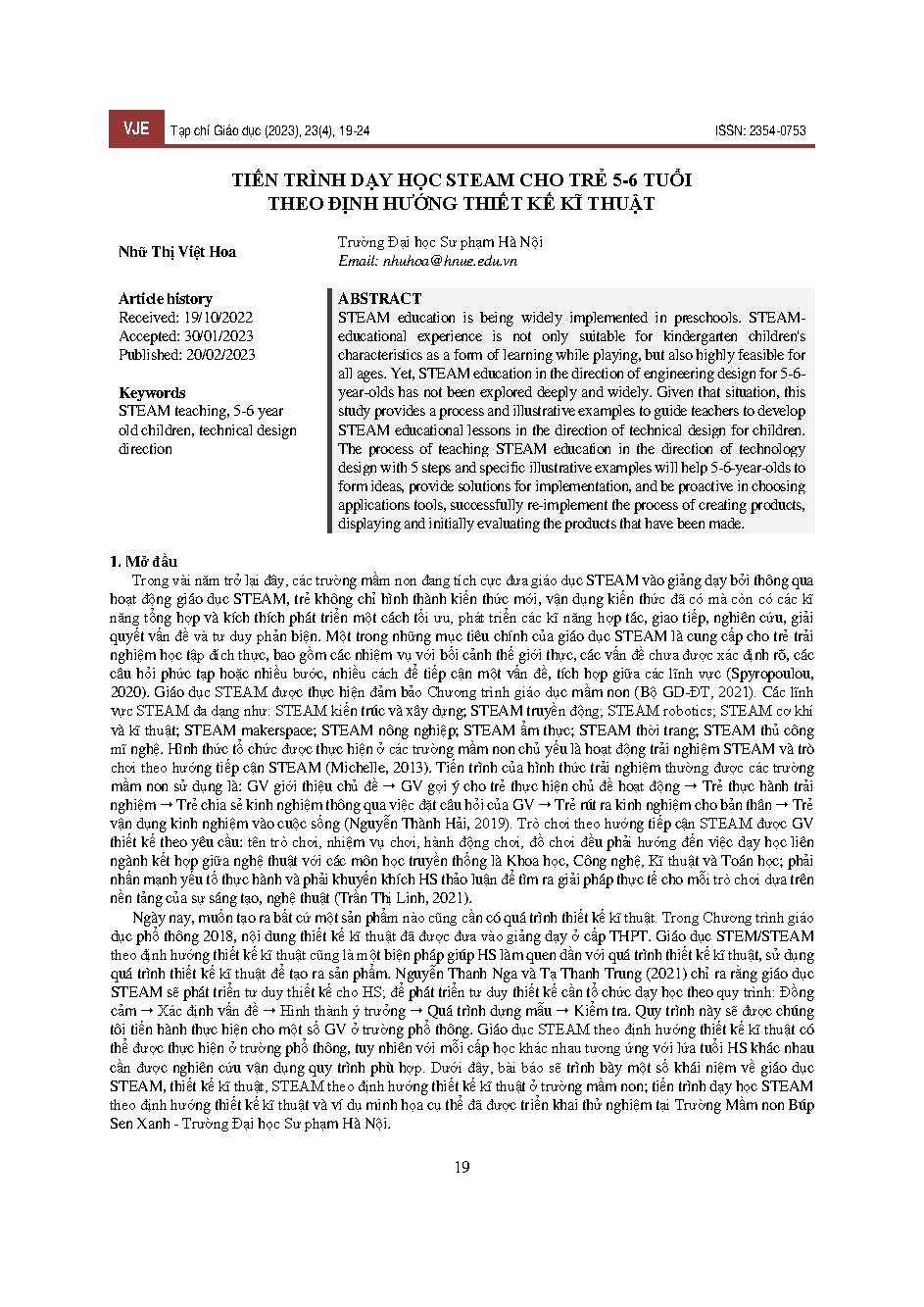 Tiến trình dạy học steam cho trẻ 5-6 tuổi theo định hướng thiết kế kĩ thuật = The process of teaching steam for 5-6 years old children in the direction of technical design